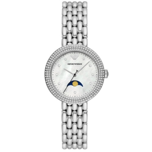 Silver-tone stainless steel case and bracelet. Fixed silver-tone bezel with crystal set. White mother of pearl dial with silver-tone hands and crystal hour markers. Minute markers around the outer rim. Dial Type: Analog. Moonphase subdials.