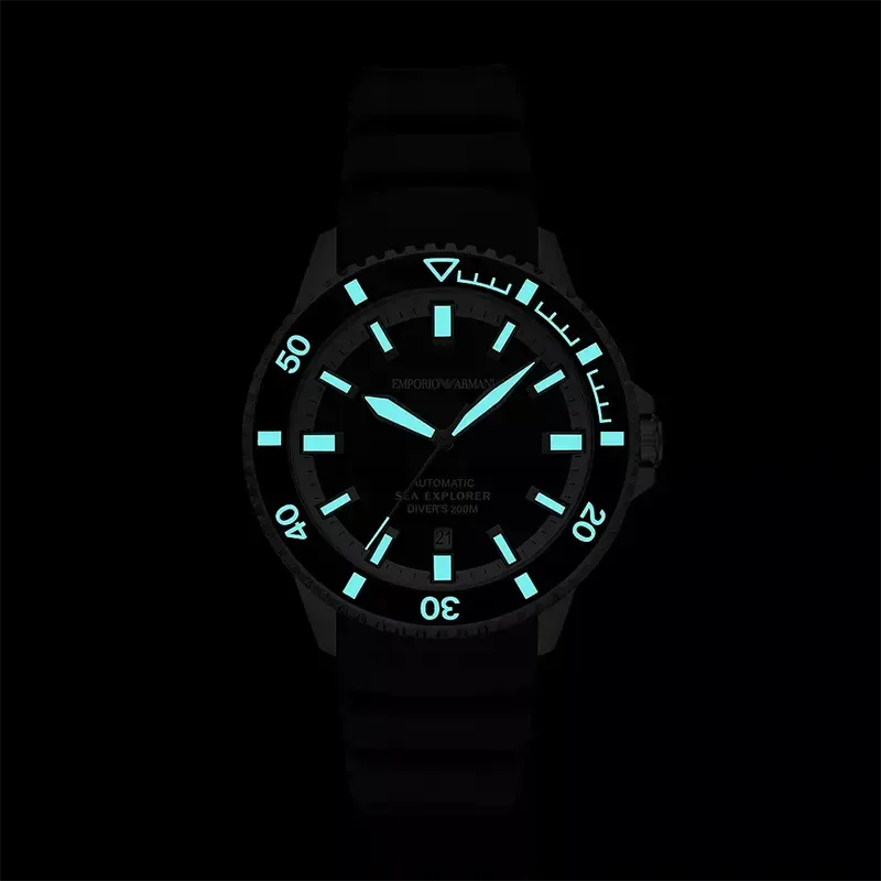 Dive into sophistication with the Emporio Armani Sea Explorer AR60086, a striking timepiece designed for the modern man. Featuring a bold black dial paired with a comfortable black silicone strap, this watch seamlessly transitions from boardroom to beach. The durable silicone construction ensures reliability in any environment, while Emporio Armani's iconic design delivers timeless elegance. Whether you're exploring new horizons or commanding everyday moments, this Sea Explorer watch combines Italian craftsmanship with contemporary style. An essential addition to any discerning gentleman's collection.