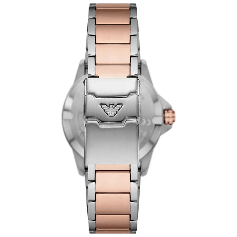Brand: Emporio Armani, Series: Sea Explorer, Gender: Men's, Model: AR11591, Movement: Japan Quartz, Case Size: 42mm, Dial Color: White, Case Thickness: 11.7mm, Case Material: Stainless Steel, Case Shape: Round, Case Back: Solid, Band Material: Stainless Steel, Band Type: Bracelet, Band Color: Rose Gold & Silver-Tone,