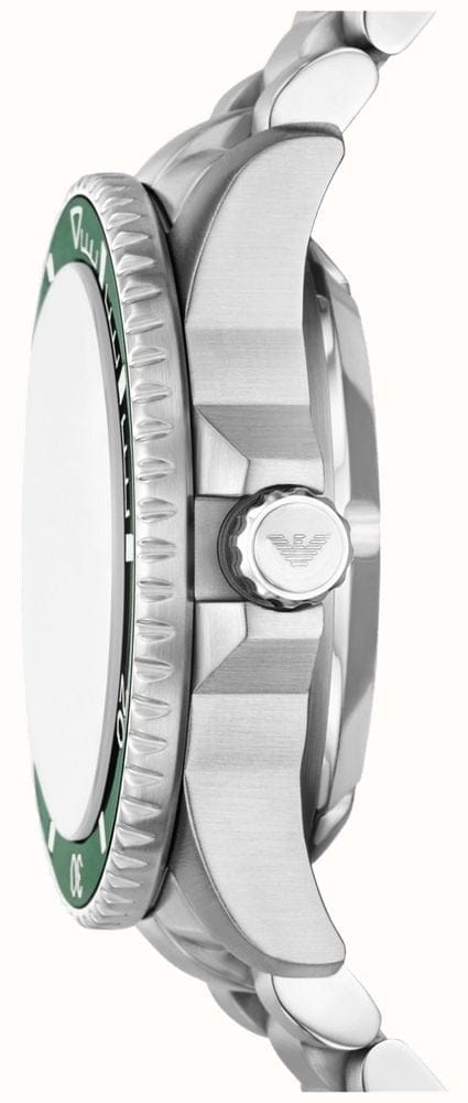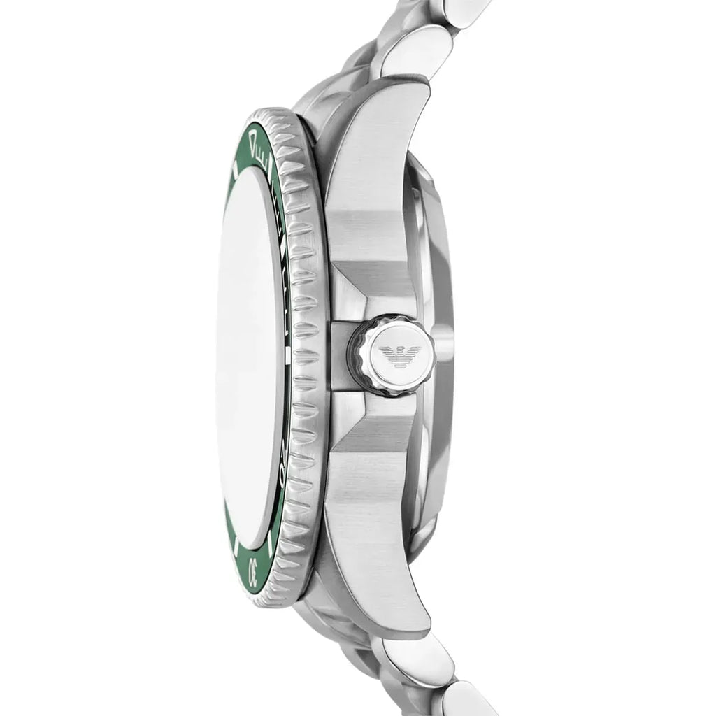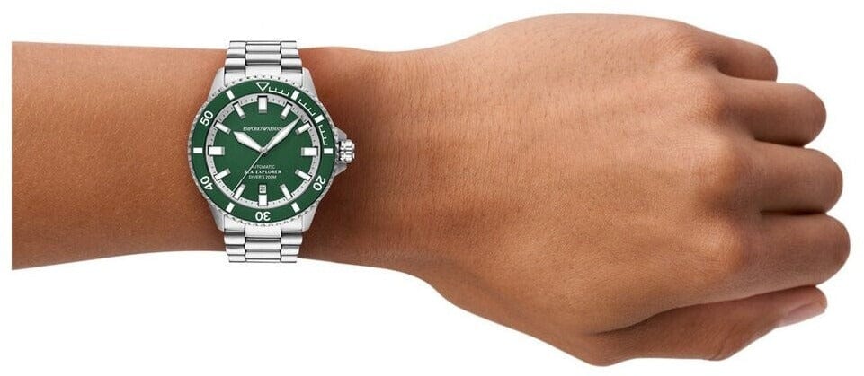 Emporio Armani's 42.5mm Sea Explorer watch features a glossy green enamel dial, green aluminium bezel insert, Super-LumiNova® on hands, indexes and bezel markings, sapphire crystal, automatic movement, 20 ATM, a screwed crown and stainless steel bracelet. ISO Certification.