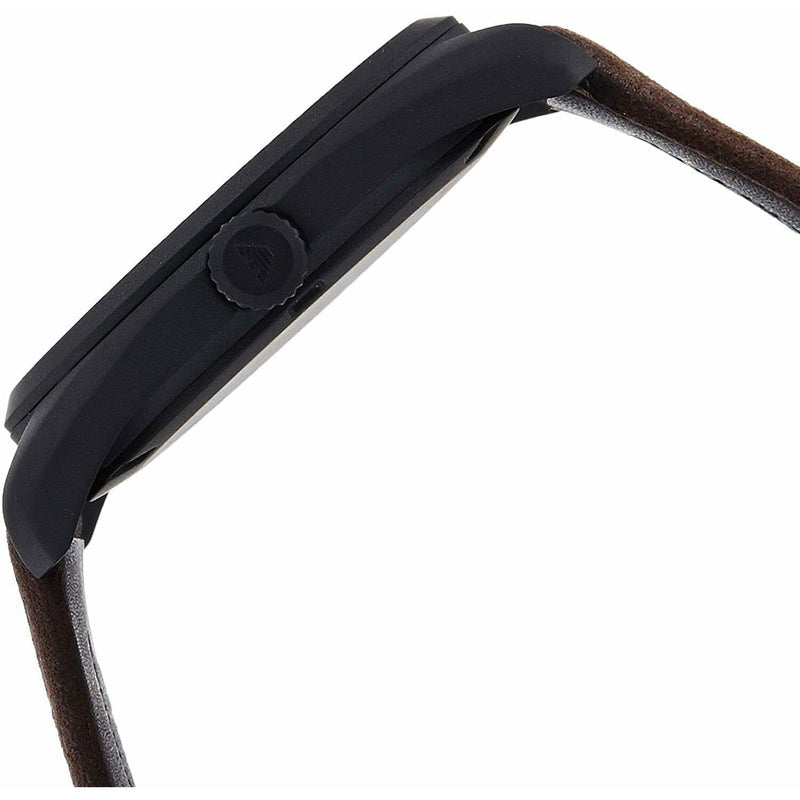 Black ion-plated stainless steel case with a dark brown leather strap. Fixed black ion-plated bezel. Beige sunray dial with luminous silver-tone hands and index hour markers. Minute markers around the outer rim. The Emporio Armani logo appears at the 12 o'clock position. Dial Type: Analog. Luminescent hands and markers. Date display at the 4 o'clock position. Quartz movement.