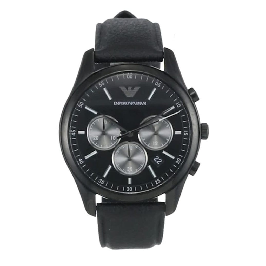 The Emporio Armani AR11583 Antonio Chronograph presents a bold aesthetic with its sleek black stainless-steel case and matching leather strap, offering a sophisticated contrast against its black dial. Powered by a reliable quartz chronograph movement, it ensures precise timekeeping and stopwatch functionality.