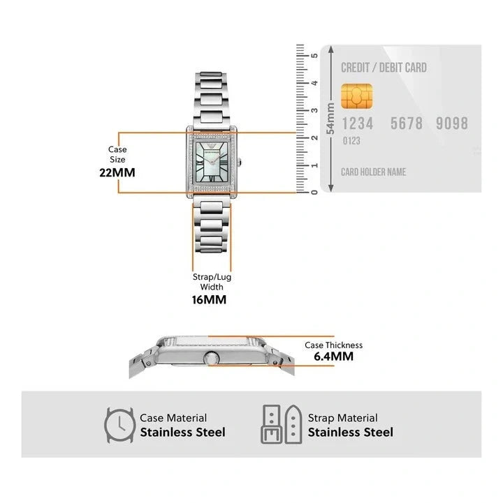• Case Size: 22x32 mm, Dial Color: Mother Of Pearl, Case material: Gold Tone Stainless Steel, Case Thickness: 6.4 mm, Case Color: Silver.