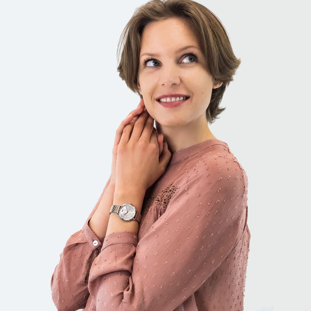 This Emporio Armani Silver Sunray Dial Two-Tone Ladies Watch AR11113 adds elegance to any outfit with a silver-tone case, silver sunray dial with applied floral design and two-tone seven-link bracelet.