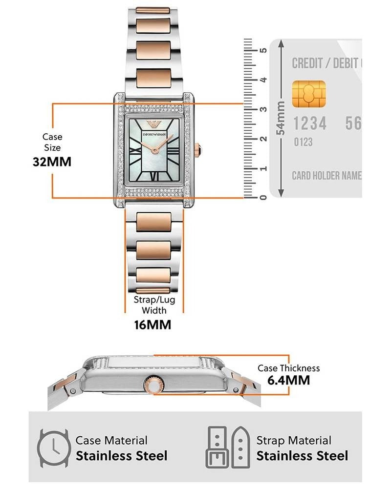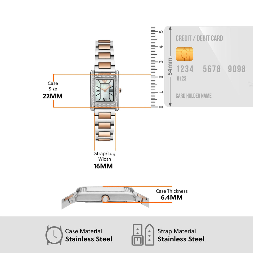 - Emporio Armani's 22mm x 32mm watch features a mother-of-pearl dial, two-hand movement and two-tone stainless steel bracelet.