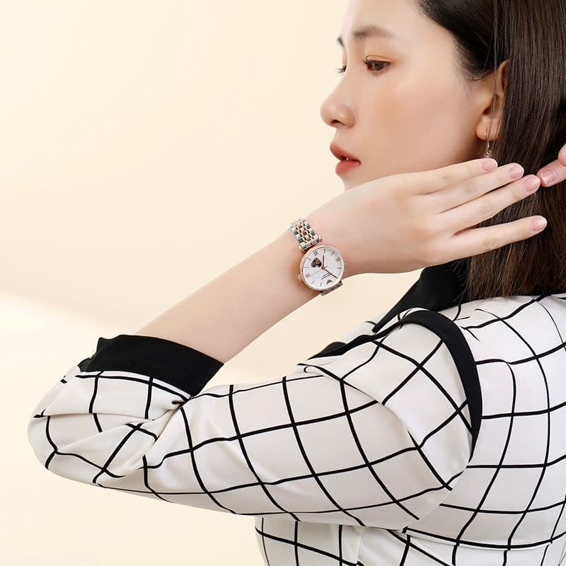 Rose gold-tone stainless steel case with a two-tone (silver-tone and rose gold-tone) stainless steel bracelet. Fixed rose gold-tone bezel set with crystals. White (open heart) dial with rose gold-tone hands and index hour markers. Roman numerals appear at the 3, 6 and 9 o'clock position. Automatic movement.