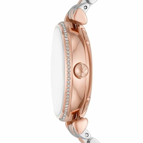 Emporio Armani ladies automatic watch in two tone stainless steel bracelet with best material. Silver stainless steel case which holds the watch mechanism. The crown is in small size attached with 3 hour. The dial of the watch is in shining mother of pearl colour. The logo is there at the place of 12 hour.