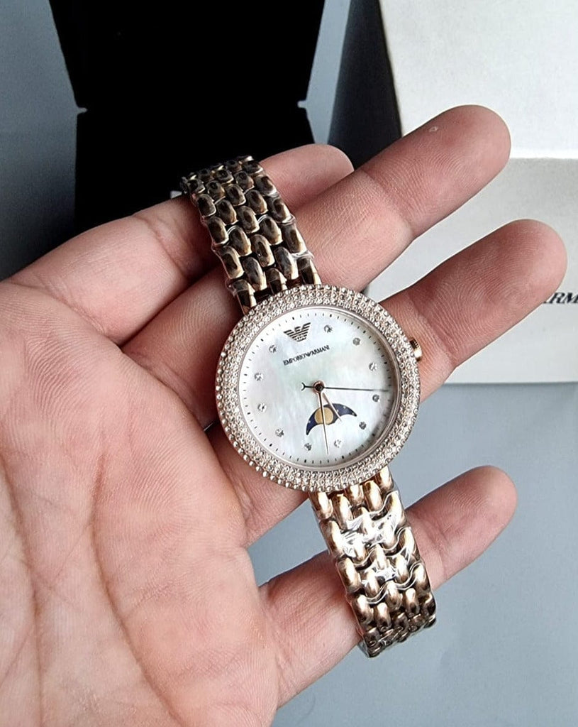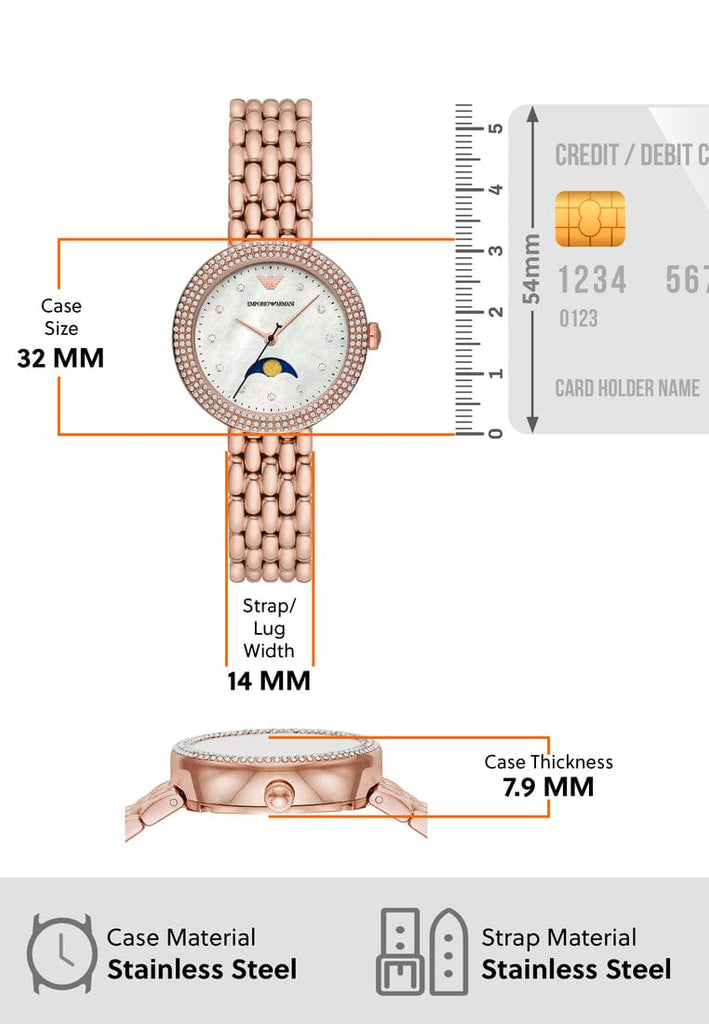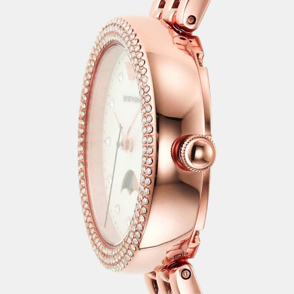 Emporio Armani watch featuring a 32mm diameter case with moon phase movement Polished white mother-of-pearl dial paired with a rose gold-tone stainless steel bracelet.