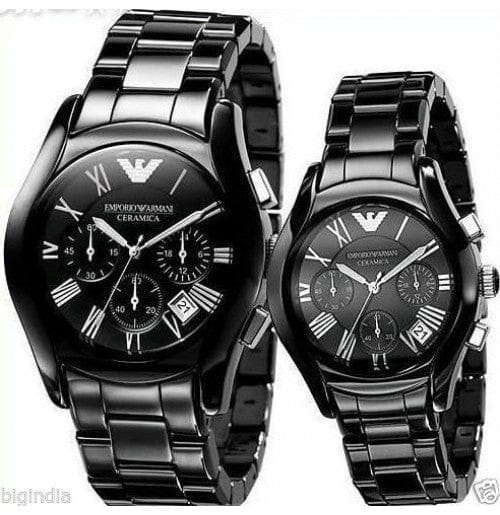 This Emporio Armani timepiece is in ceramic and stainless steel. The case has a smooth bezel and the black dial has Roman numeral hour markers and three hands. This designer quartz/chronograph watch for women is a beautiful accessory you will love wearing.