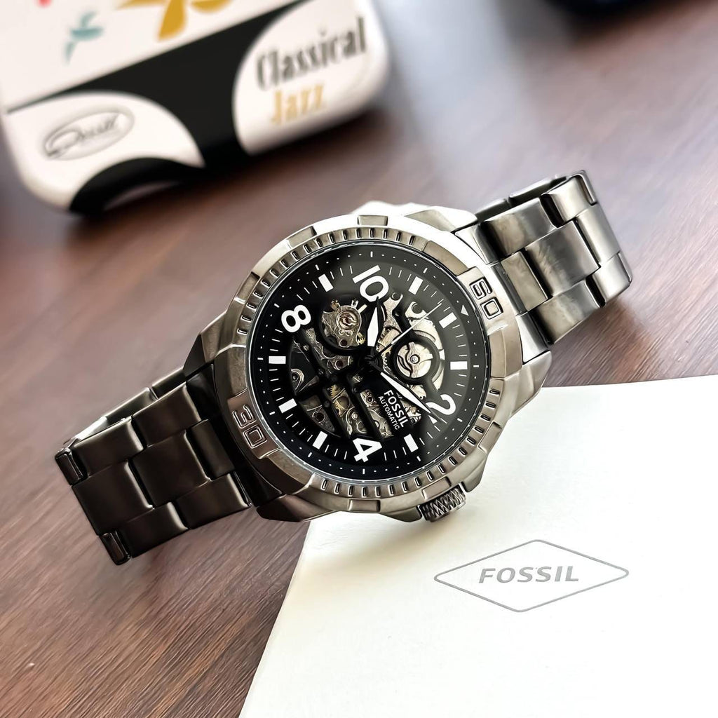 Fossil Bronson Automatic Skeleton Black Dial Grey Steel Strap Watch for Men - ME3255