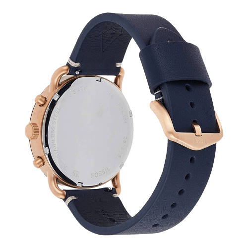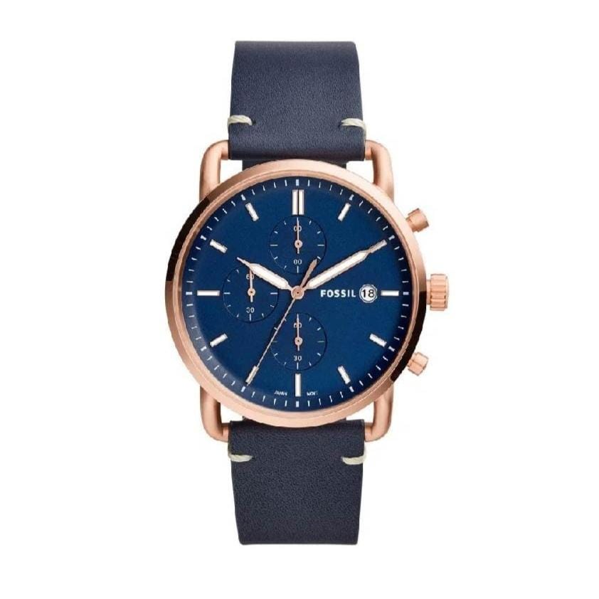 Fossil FS-5404 Commuter Leather Strap Men’s Watch. The case is made out of rose gold stainless steel with a rose gold bezel, which stands for the high quality of the item, it has a blue Dial. This model has got 100 meters of water resistance. it can be worn in scenarios where it is likely to be splashed but not immersed in water and will be fine in rain. The watch is shipped with an original box and a guarantee from the manufacturer.