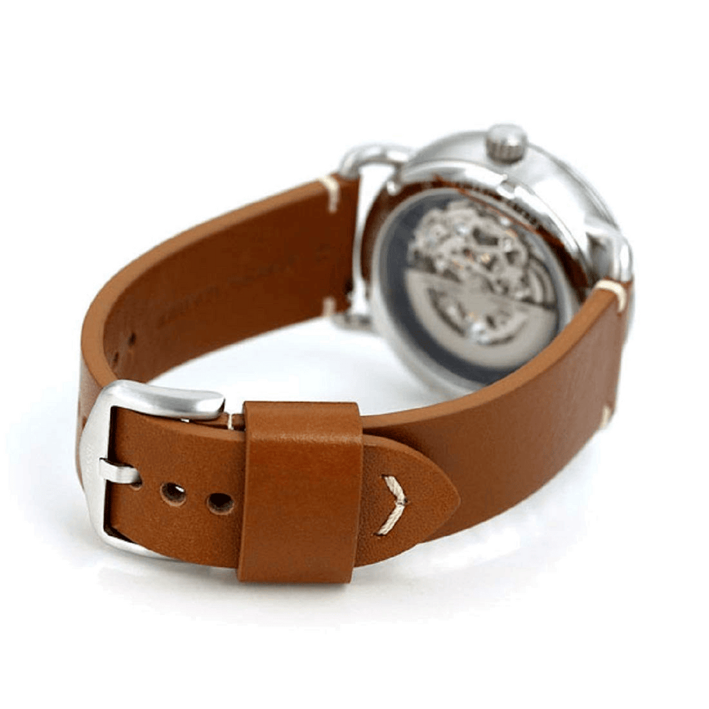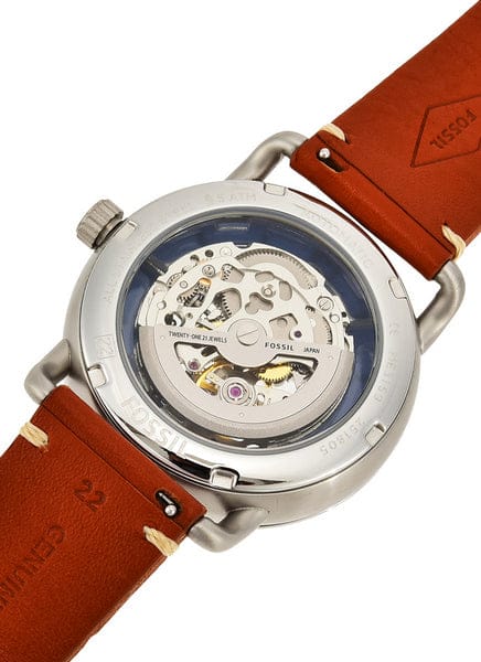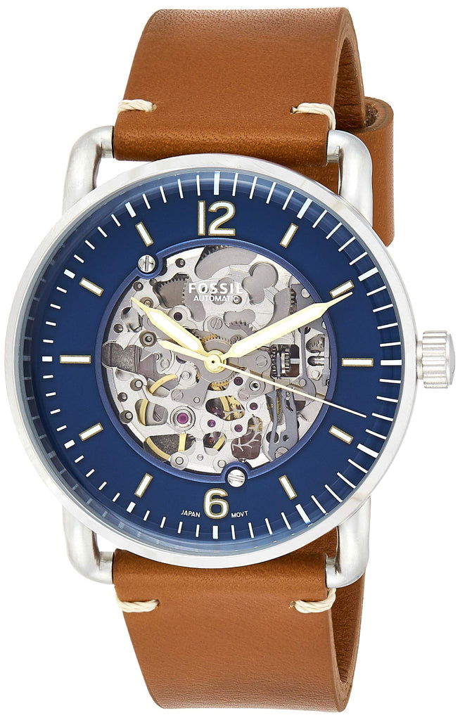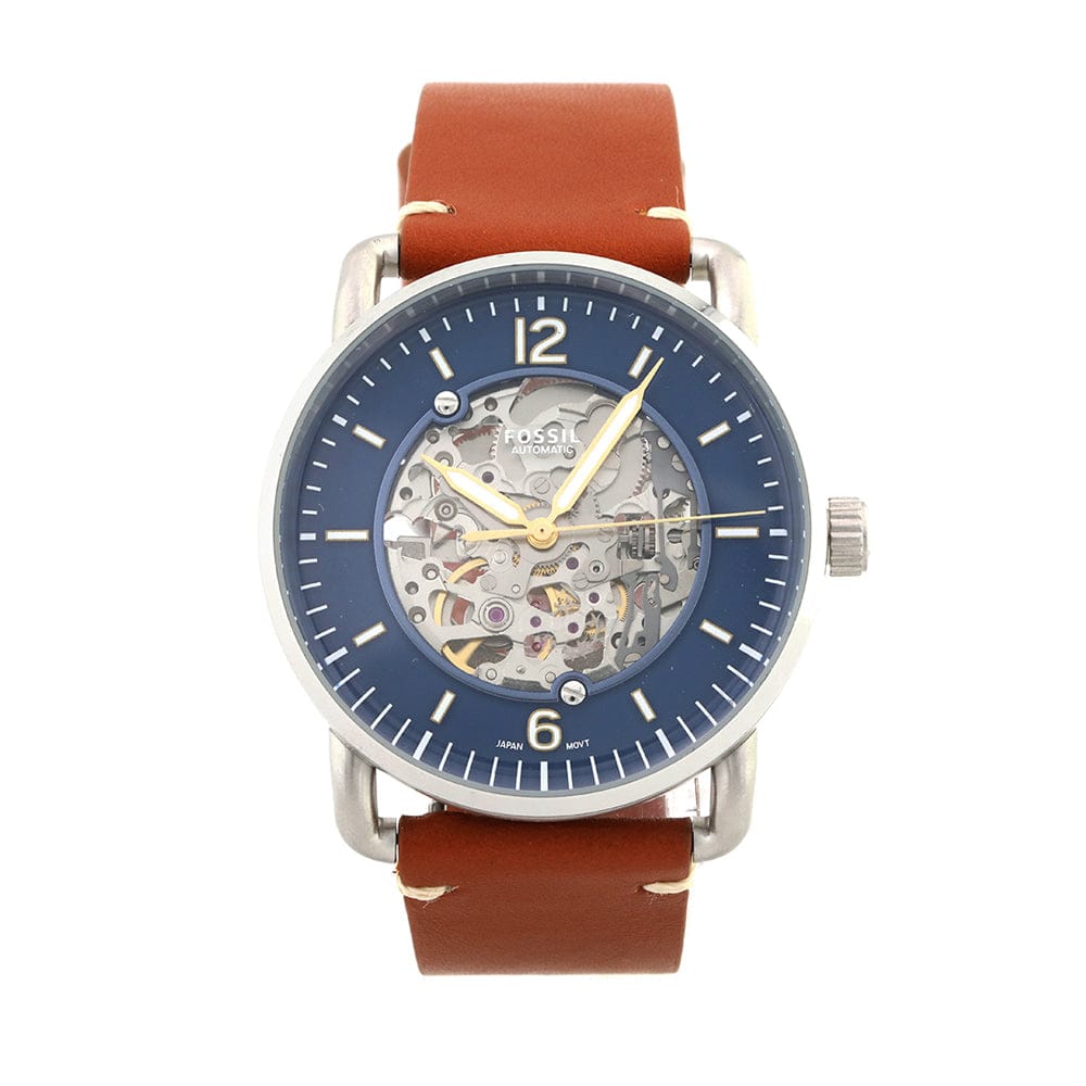 Fossil Commuter Automatic Skeleton Blue Dial Brown Leather Strap Watch for Men - ME3159