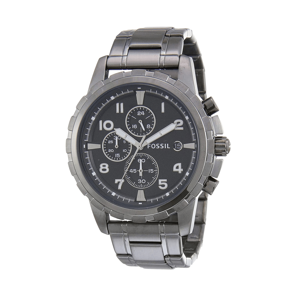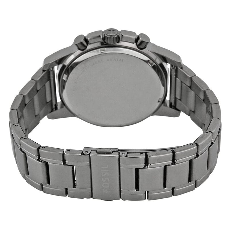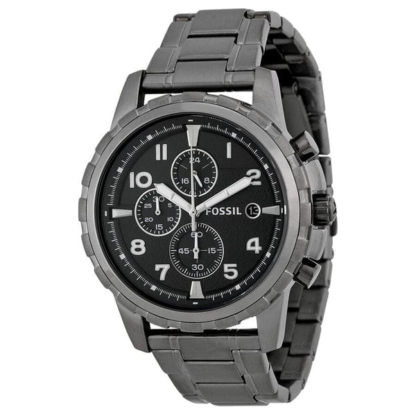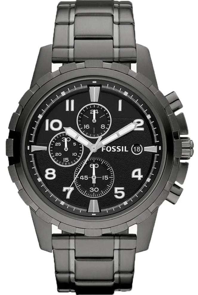 Scratch resistant mineral crystal. Pull / push crown. Solid case back. Case diameter: 45 mm. Case thickness: 11 mm. Round case shape. Band width: 24 mm. Fold over clasp with a safety release. Water resistant at 50 meters / 165 feet. Functions: chronograph, date, hour, minute, second. Casual watch style. Fossil Dean Chronograph Black Dial Smoke Grey Ion-plated Men's Watch FS4721.