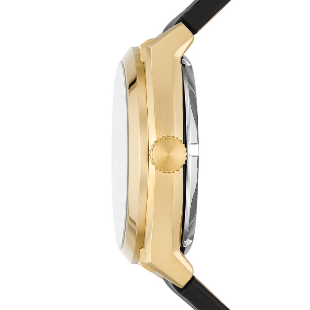 Set in a gold plated case, the Fossil ME3208 Everett Automatic Mens Watch excites with its classy style. The captivating automatic movement is on full display, showcased in a unique skeleton dial. A black leather strap returns this timepiece to classic dress watch style.