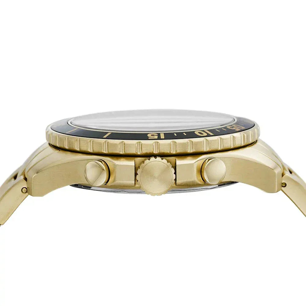 Yellow gold-plated stainless steel case and bracelet. Yellow gold-plated bezel with an inlaid black ring. Black dial with luminous yellow gold-tone hands and dot hour markers. Minute markers around the outer rim. Luminescent hands and markers. Date display between the 4 and 5 o'clock positions. Chronograph - three sub-dials displaying: 60 second, 30 minute and 24 hour.