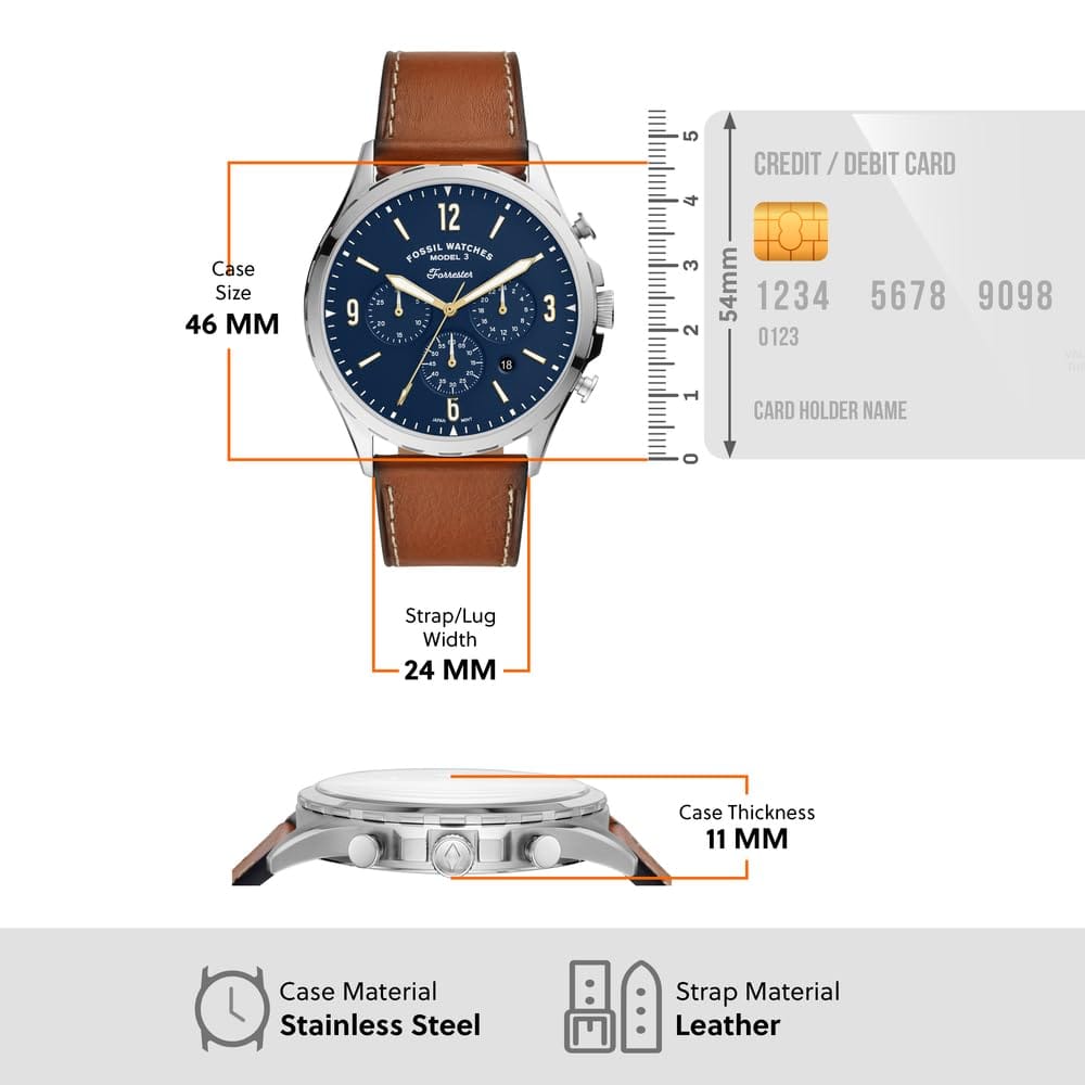 Chronograph - three sub-dials displaying: 60 second, 30 minute and 24 hours. Quartz movement. Scratch resistant mineral crystal. Pull / push crown. Solid case back. Round case shape. Case size: 46 mm. Case thickness: 11 mm. Band width: 24 mm. Tang clasp. Water resistant at 50 meters / 165 feet. Functions: chronograph, date, hour, minute, second. Forrester Series. Dress watch style. Watch label: Japan Movt. Fossil Forrester Chronograph Quartz Blue Dial Men's Watch FS5607.