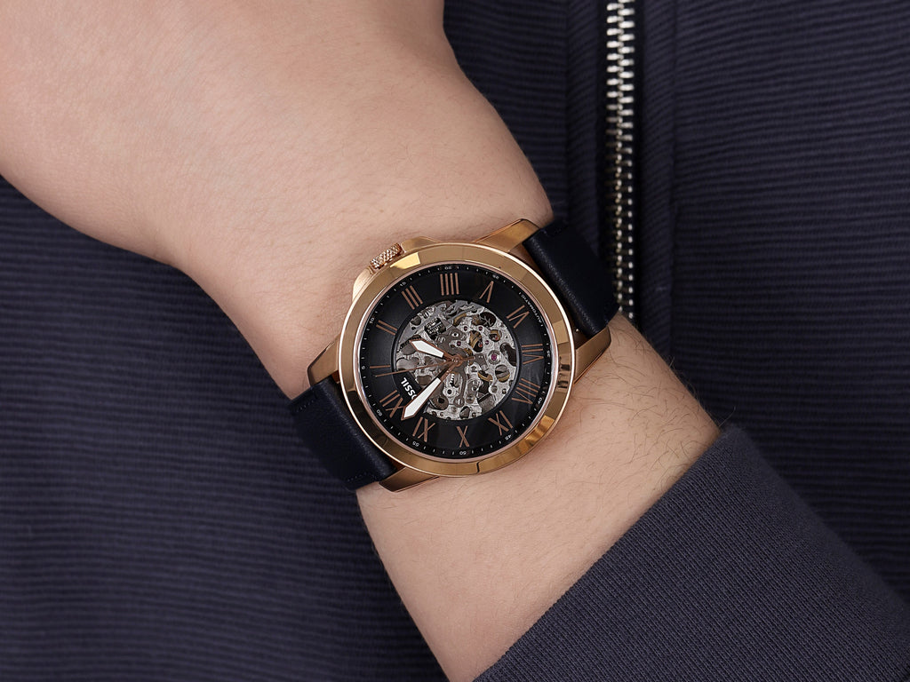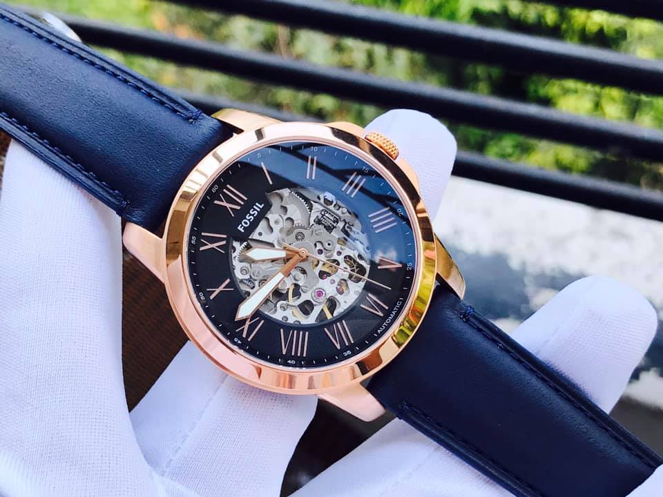 Fossil Grant Automatic Skeleton Blue Dial Blue Leather Strap Watch for Men - ME3102