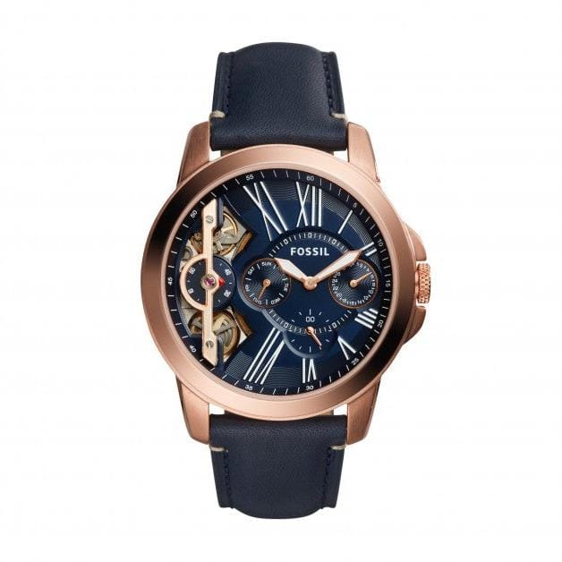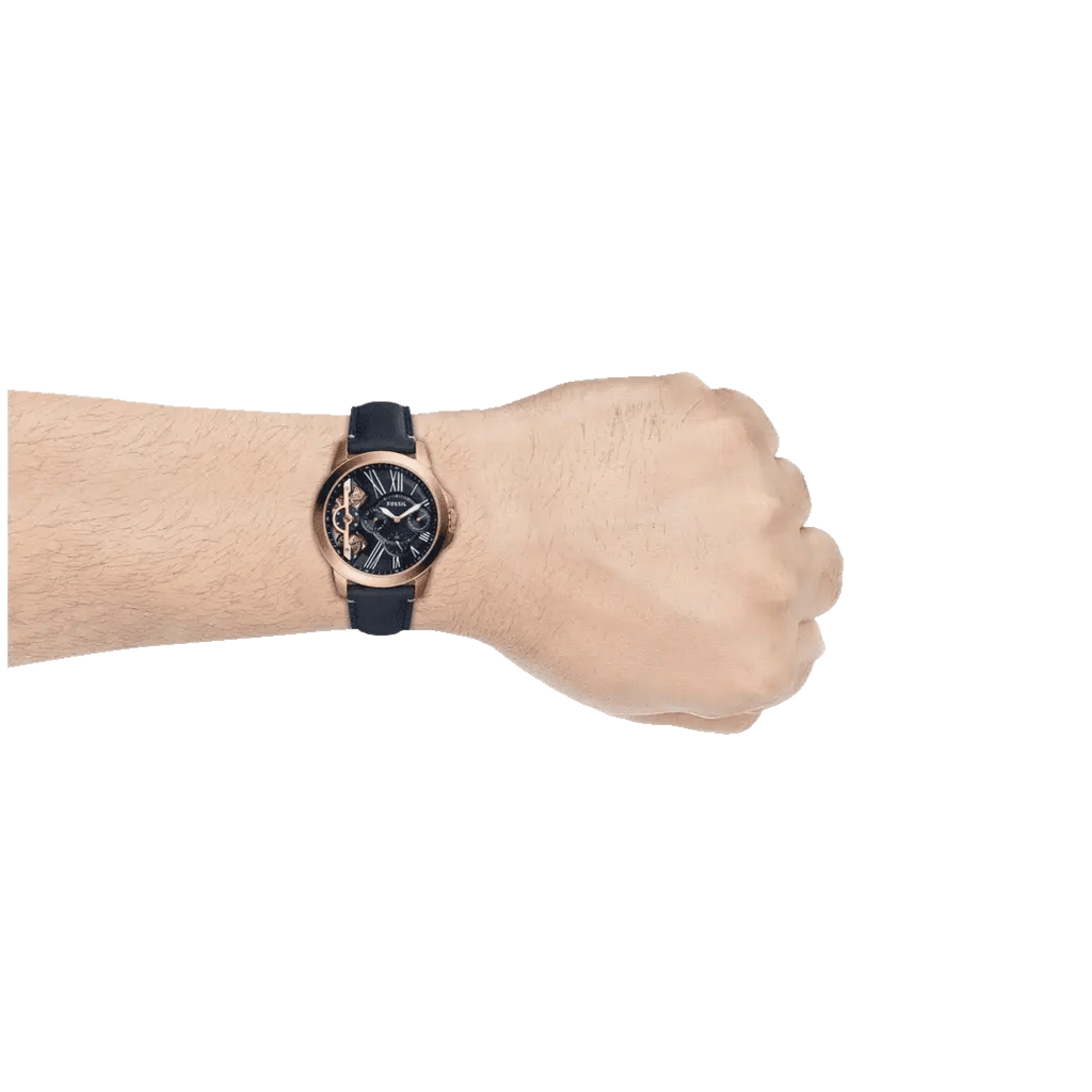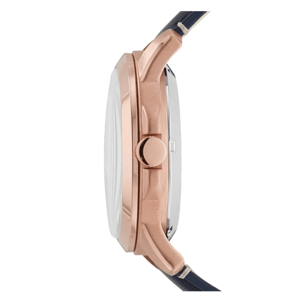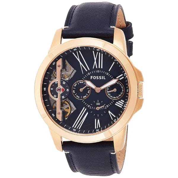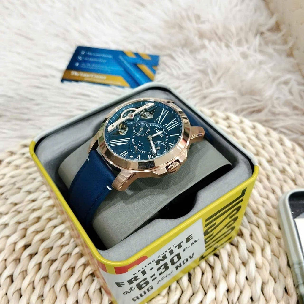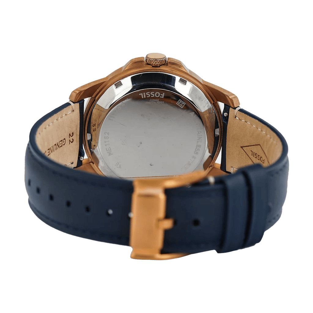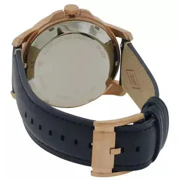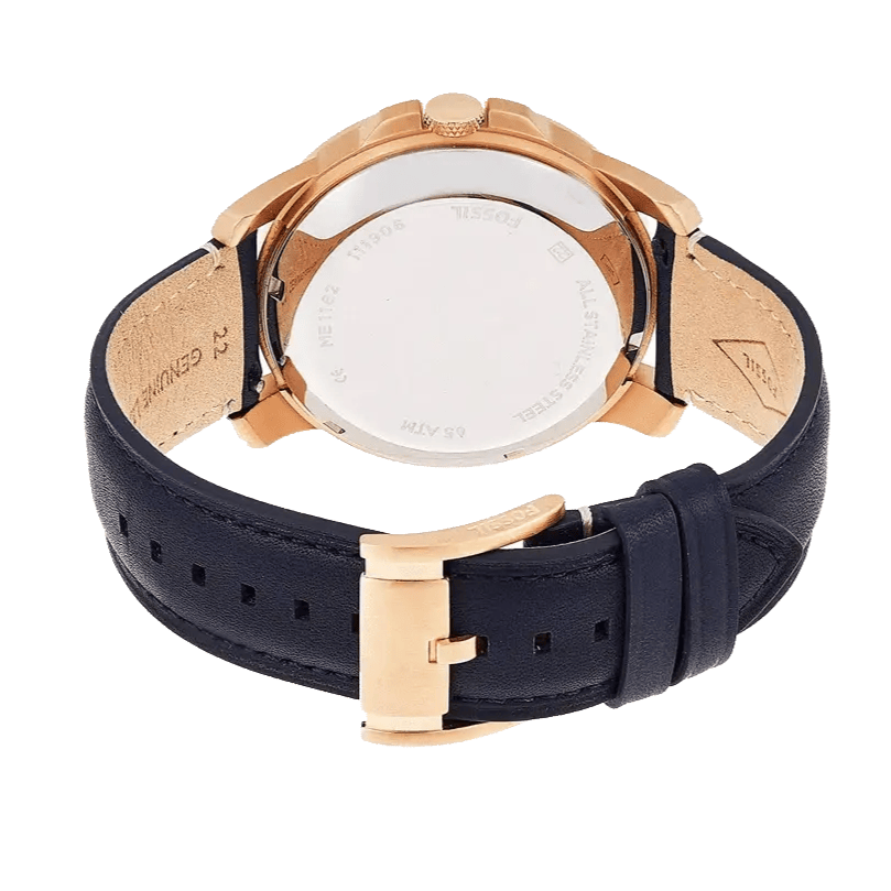 This men's analogue watch by Fossil is an absolute stunner. The simple navy blue leather strap, with buckle closure, ensures that the watch doesn't go overboard with the stunning details of the dial. Encased in a rose gold stainless steel case is a blue coloured dial with three sub-dials. The two silver hands and the Roman numerals in one half of the dial shine out against the blue of the dial.