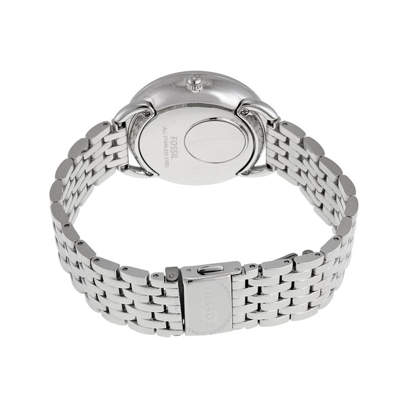 Solid case back. Case diameter: 36 mm. Case thickness: 9 mm. Round case shape. Band width: 14 mm. Fold over clasp. Water resistant at 30 meters / 100 feet. Functions: date, day, hour, minute, second, 24 hour. Casual watch style. Fossil Jacqueline Multi-Function White Dial Stainless Steel Ladies Watch ES3755.