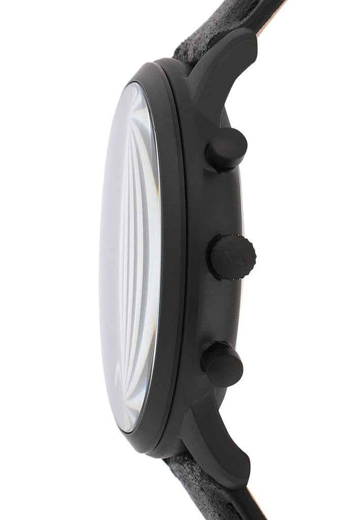 Encompassed in a 44mm case, the black matte round dial with chronograph functionality exudes plain three hands operational on a quartz movement, three subdials, stick markings at five-minute intervals, a date display window, a crown for time adjustment, two pushers and Roman numerals at the 6th and 12th-hour positions. Its black genuine leather strap can be interchanged with all 22mm straps to customize your look.