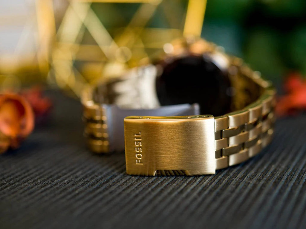 - Gold plated stainless steel bracelet with single pusher foldover clasp closure; interchangeable with Fossil 22mm watch straps