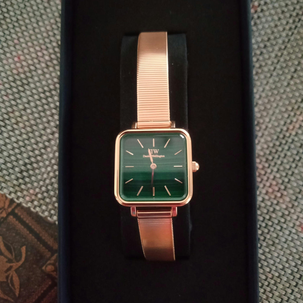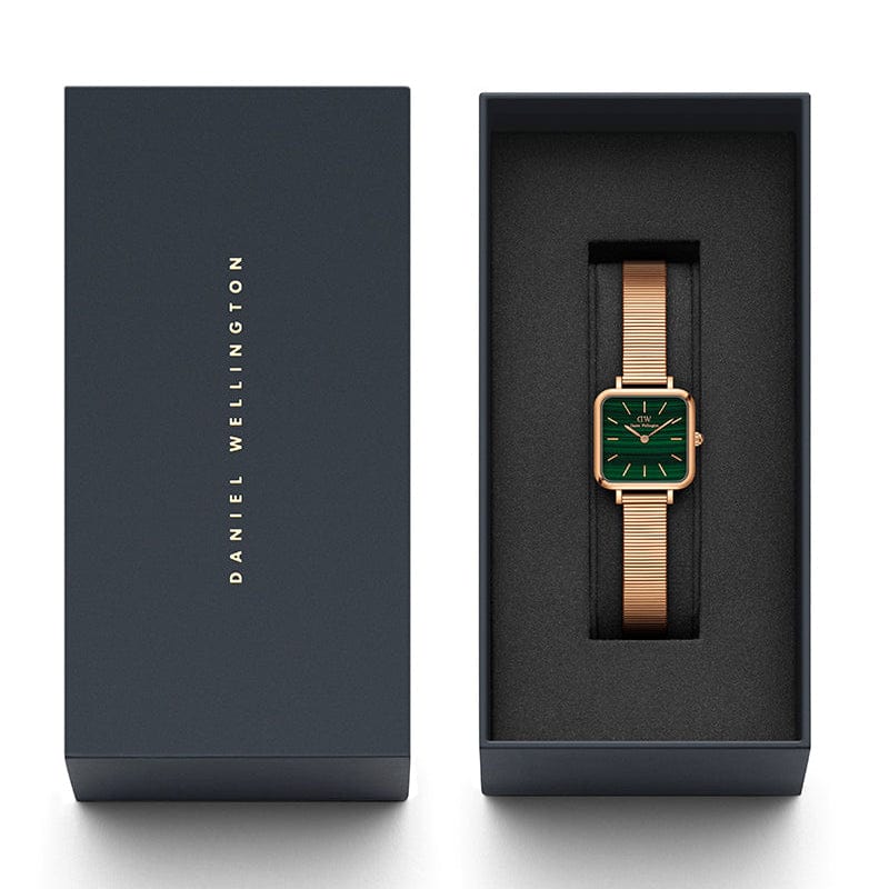 Elevate your style with the Daniel Wellington Quadro Studio watch. Featuring a green dial, rose gold mesh strap, and chic design, this watch adds a touch of sophistication to any outfit. Stay punctual and fashion-forward with this sleek timepiece.