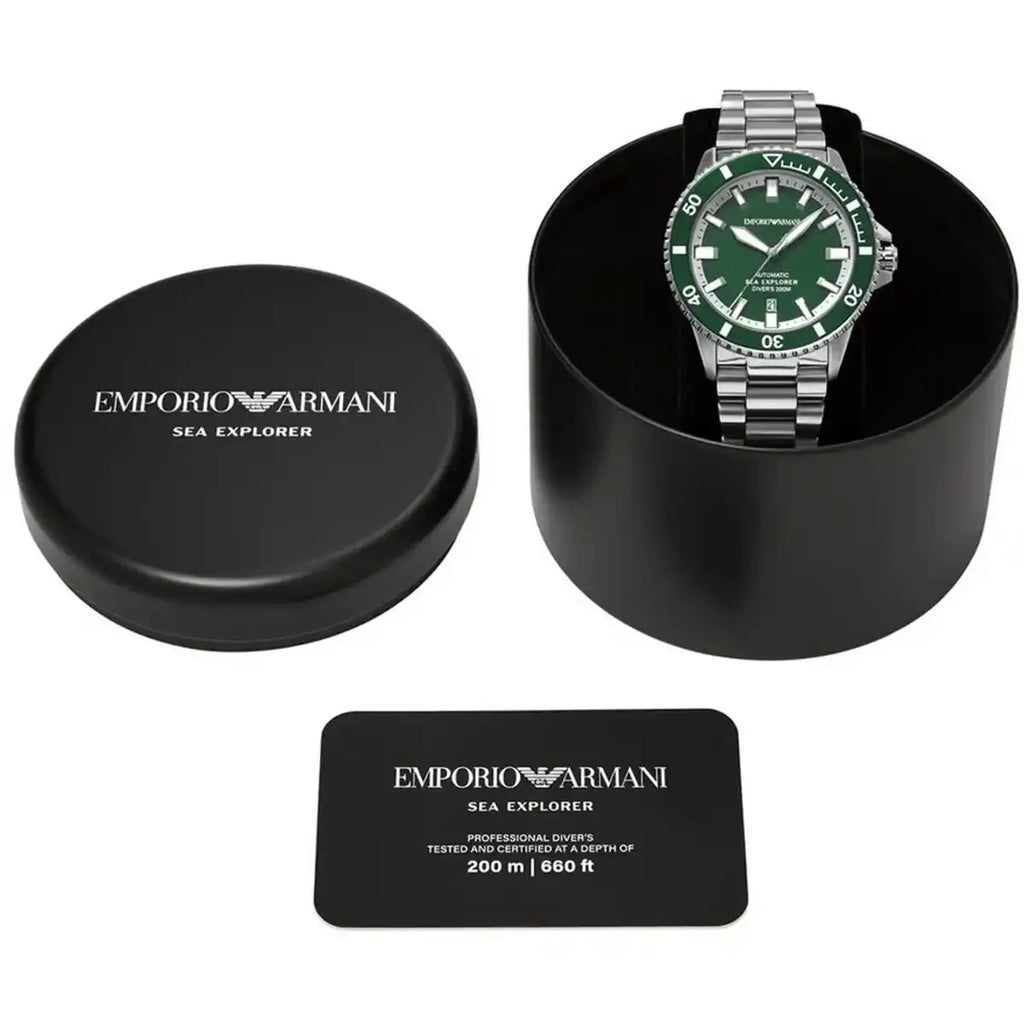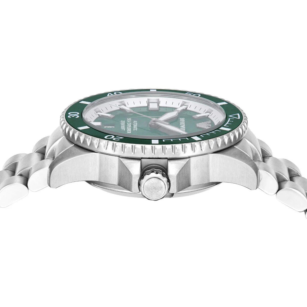 Emporio Armani's 42.5mm Sea Explorer watch features a glossy green enamel dial, green aluminium bezel insert, Super-LumiNova® on hands, indexes and bezel markings, sapphire crystal, automatic movement, 20 ATM, a screwed crown and stainless steel bracelet. ISO Certification.