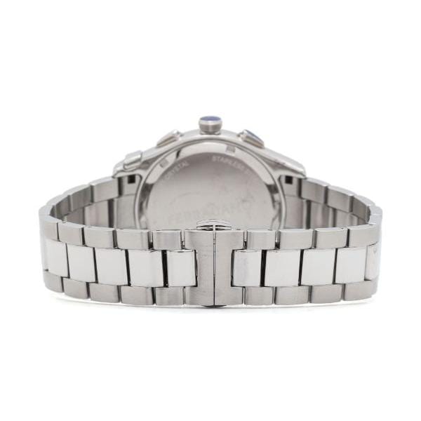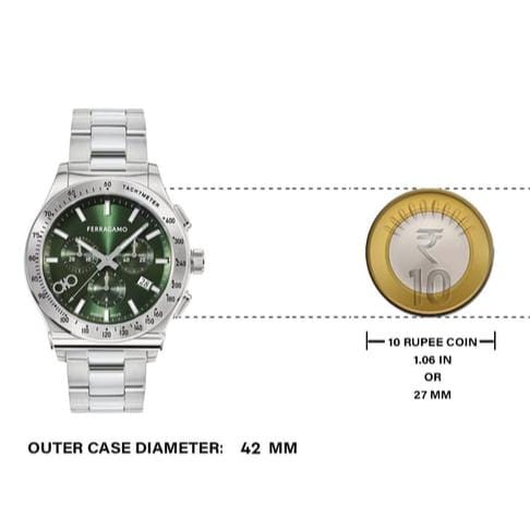 Set in a high shine case, this men's analog watch from Ferragamo is sure to catch your attention. Operated by a quartz movement and safeguarded by a , the green round dial is encased in a 42 mm case. It features plain three hands. The stainless steel strap exudes a silver hue that accentuates the look of the watch. Moreover, it is fitted with a deployment clasp with push button clasp that ensures a secure fit on the wrist.