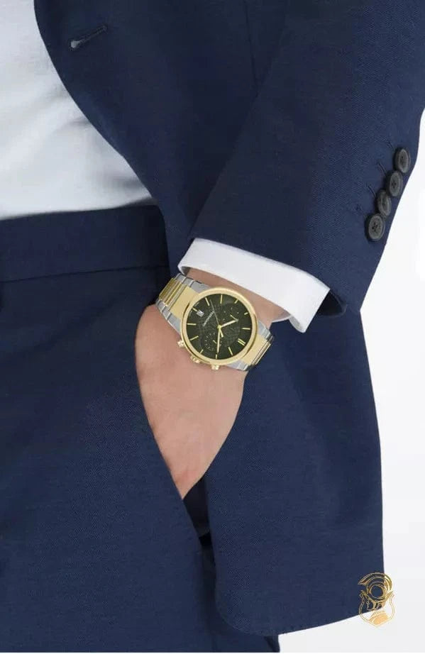 Combining simplicity and performance, this men's analog watch from Ferragamo is sure to impress you. Enclosed in a 41 mm case, the green round dial is secured by a . It displays chronograph. The stainless steel strap exudes a two tone hue that accentuates the look of the watch. Besides, it is finished with a clasp to provide a secure fit on the wrist.