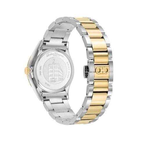 A must-have timepiece for all the watch aficionados, this men's analog watch from the collection by Ferragamo will be a perfect pick. The green round dial is protected by a sapphire glass. It features a crown for time adjustment. The stainless steel strap comes in a two tone hue that further elevates the look of the timekeeper. Besides, it is completed with a fold over clasp to ensure a secure fit on the wrist.