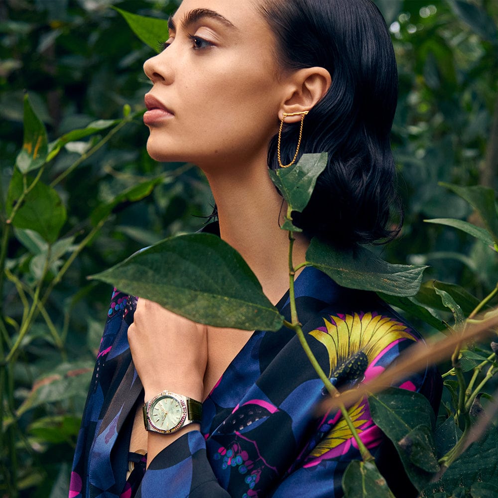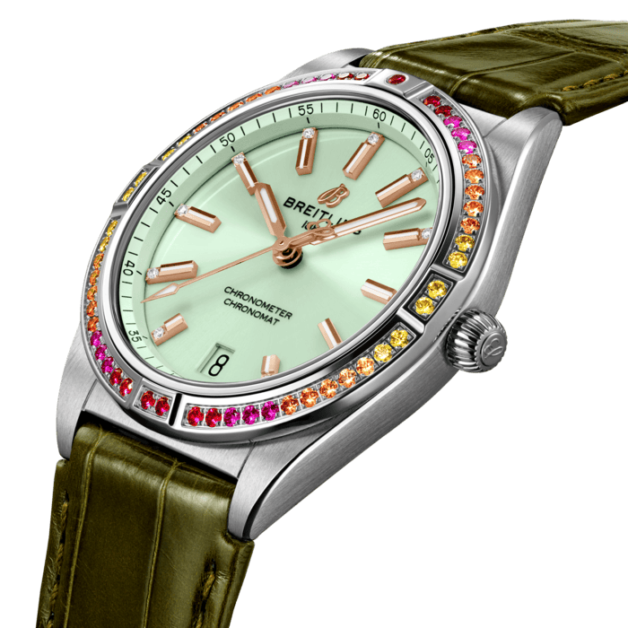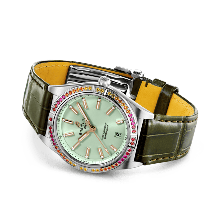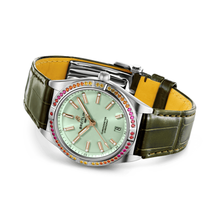 With eye-catching colors and luminescence, the Chronomat South Sea Capsule Collection evokes the intoxicating vibes of summer, marine life and lush greenery. Available in three distinctive versions, the Chronomat Automatic 36 South Sea Capsule Collection is the spirited sister of Breitling’s latest Chronomat for women. This elegantly modern retro-inspired watch is for ladies looking to stand out from the crowd. Featuring special lacquered dials with golden indexes and hands, diamond-set hour markers and cocktail-hued gem-set bezels, the Chronomat South Sea are paired to color-matched shiny alligator straps with folding clasps. The Chronomat Automatic 36 South Sea are powered by the Breitling Caliber 10, a COSC-certified chronometer.