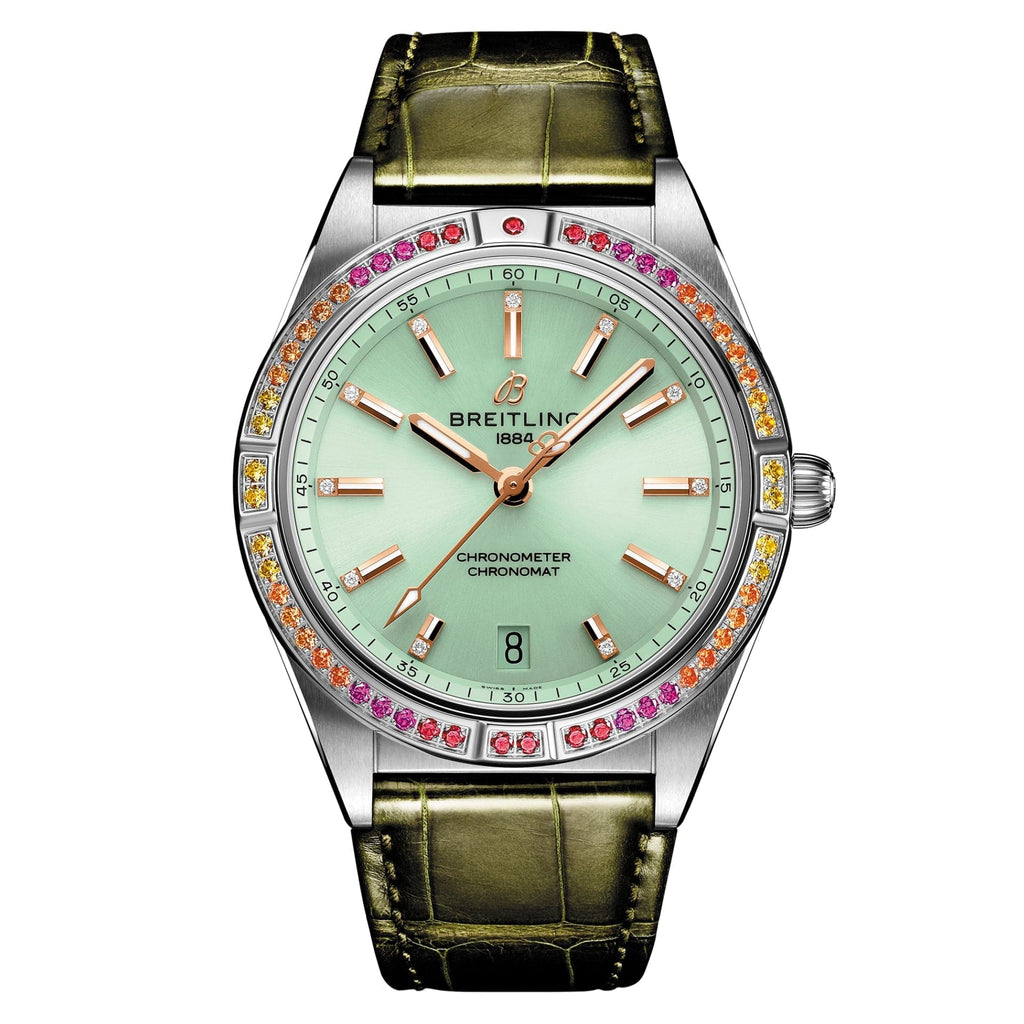 Breitling Chronomat Automatic 36 South Sea watch. Model reference: A10380611L1P1. Steel case (Gem-set). Mint green dial. Automatic movement. Green alligator leather strap with steel folding clasp. Swiss made. Watch comes in original packaging, with set of documents and 5 years warranty.