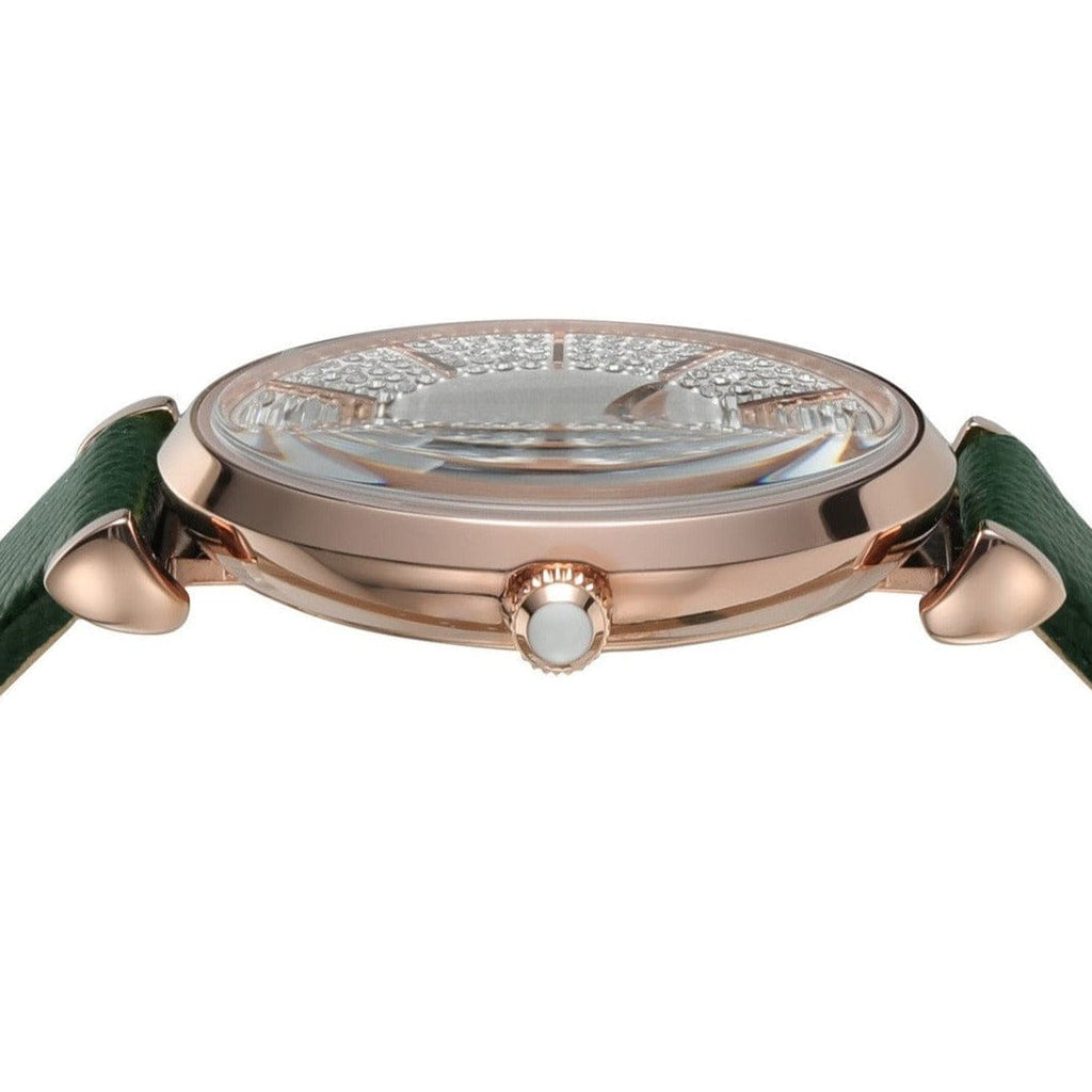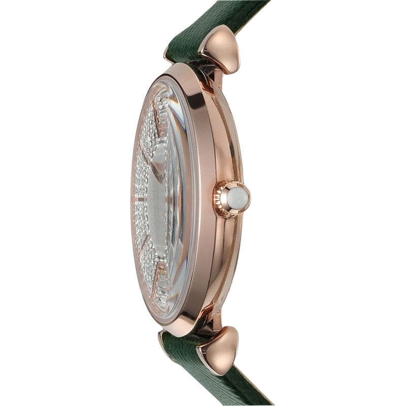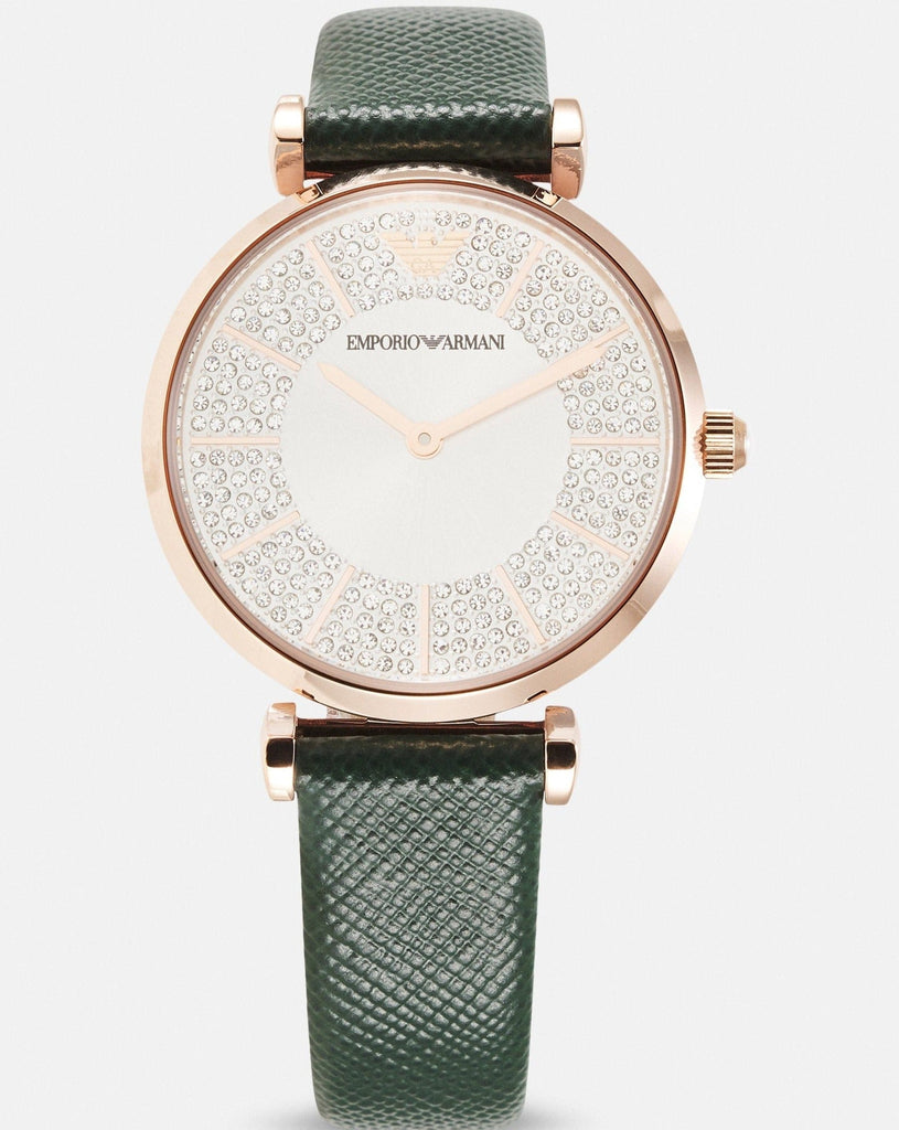 Emporio Armani's 32mm watch features a silver glossy sunray dial, two-hand movement, rose gold-tone at least 50% recycled stainless steel case and green leather strap.