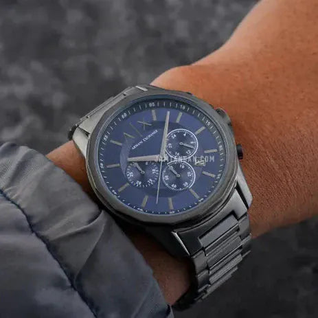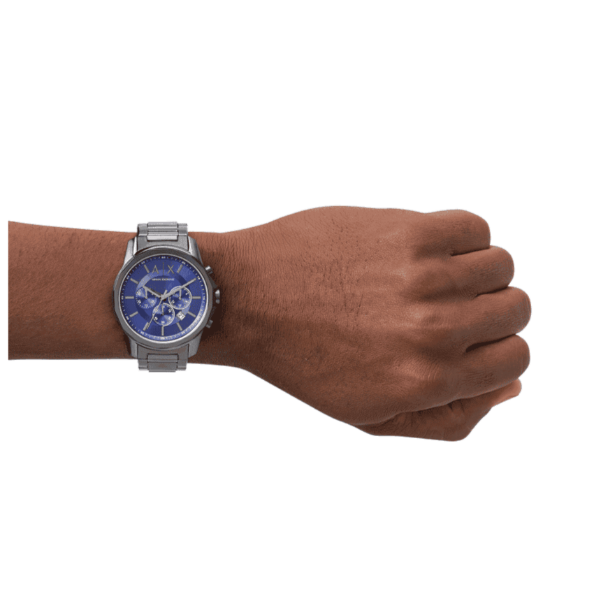 The Armani Exchange Chronograph Watch, with its sleek blue dial, is the perfect accessory for any modern man. This expertly crafted timepiece boasts precise chronograph movement and a stylish design, making it both functional and fashionable. Elevate your style with this must-have watch.