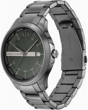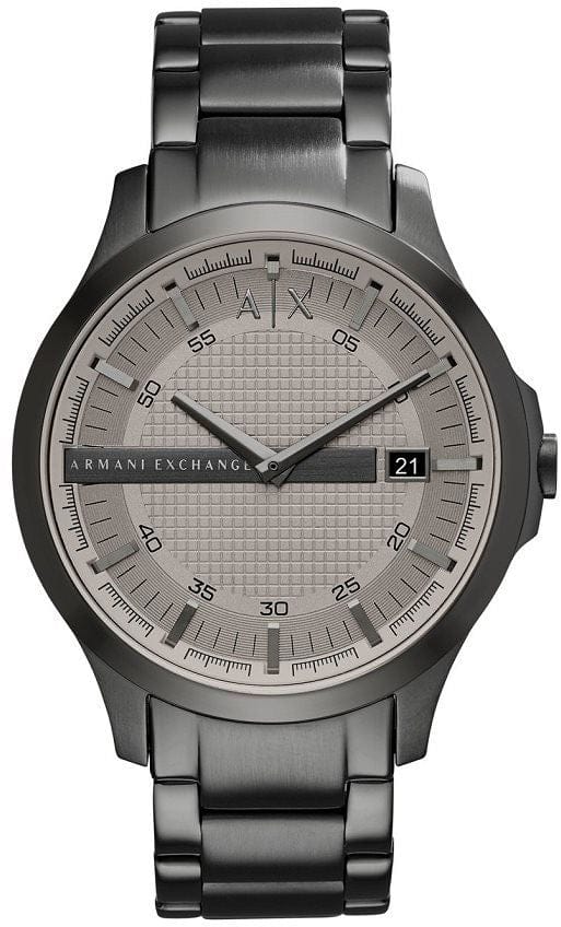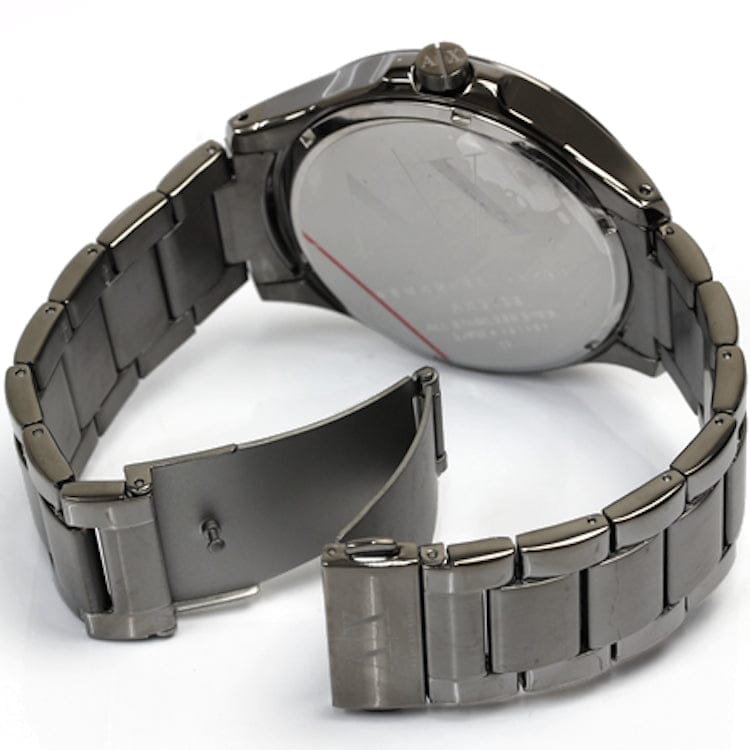 Gunmetal ion-plated stainless steel case and bracelet. Fixed gunmetal ion-plated bezel. Grey textured dial with grey hands and index hour markers. Minute markers around the outer rim. The Armani Exchange logo appears at 12 o'clock. Armani Exchange logo bar. Dial Type: Analog. Date display at the 3 o'clock position.