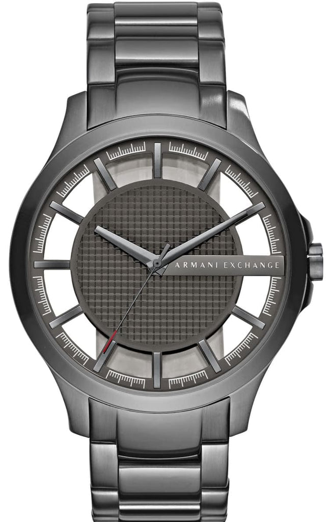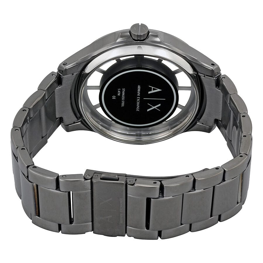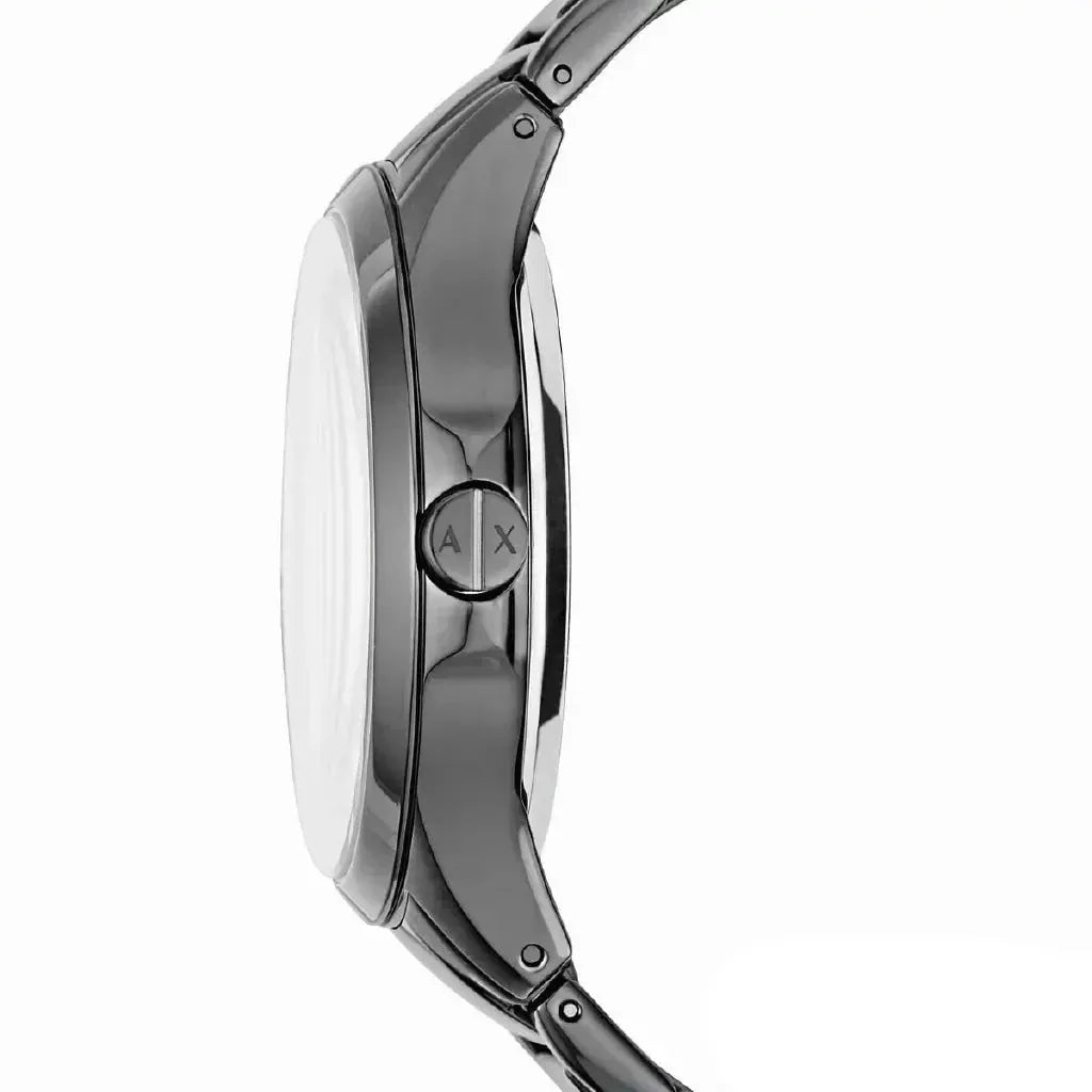 Gunmetal stainless steel case with a gunmetal stainless steel bracelet. Fixed gunmetal stainless steel bezel. Black and clear dial with black hands and index hour markers. Minute markers around the outer rim. Dial Type: Analog. Quartz movement. Scratch resistant mineral crystal. Case size: 46 mm. Round case shape. Fold over with safety release clasp. Water resistant at 50 meters / 165 feet. Functions: hour, minute, second. Casual watch style. Armani Exchange Gunmetal Bracelet Men's Watch AX2188.