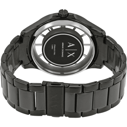 - This black IP Armani Exchange men's watch features a sleek textured black dial with cut-through index ring, glass-back detailing and a Y-link bracelet.