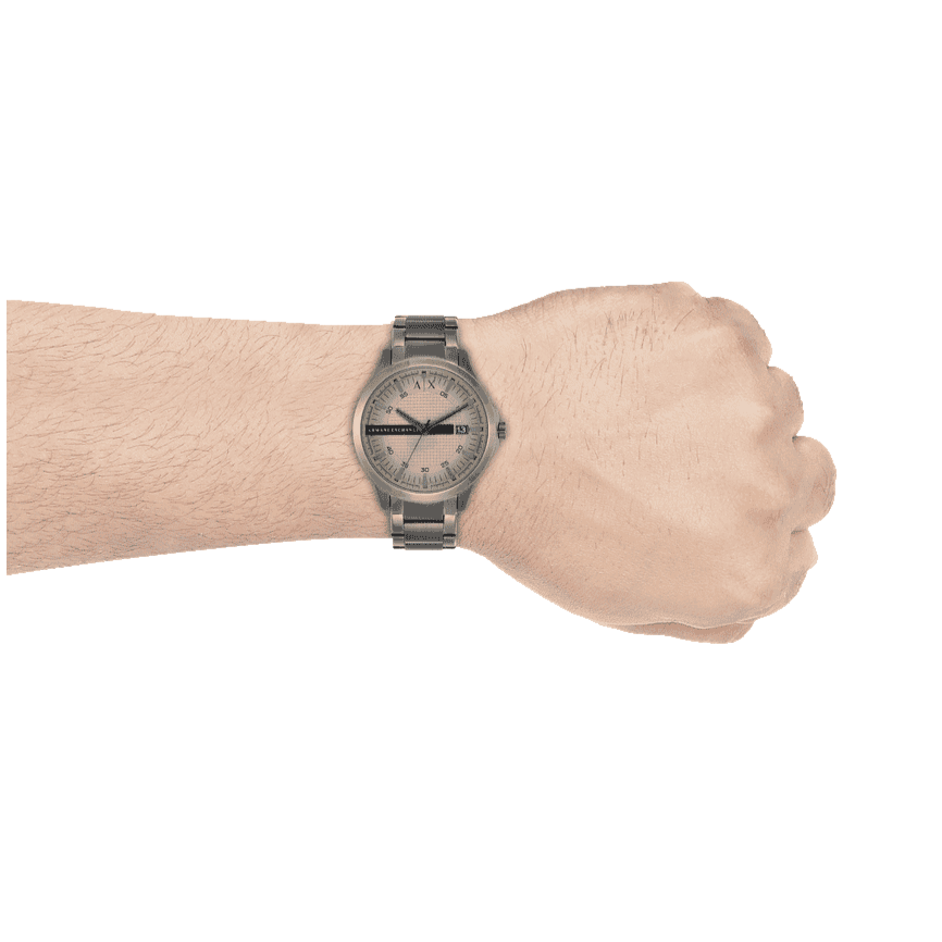 Dial Type: Analog. Date display at the 3 o'clock position. Quartz movement. Scratch resistant mineral crystal. Pull / push crown. Solid case back. Case size: 46 mm. Case thickness: 12 mm. Round case shape. Band width: 22 mm. Fold over deployment clasp. Water resistant at 50 meters / 165 feet. Functions: date, hour, minute, second. Dress watch style. Armani Exchange light Grey Dial Men's Watch AX2194.
