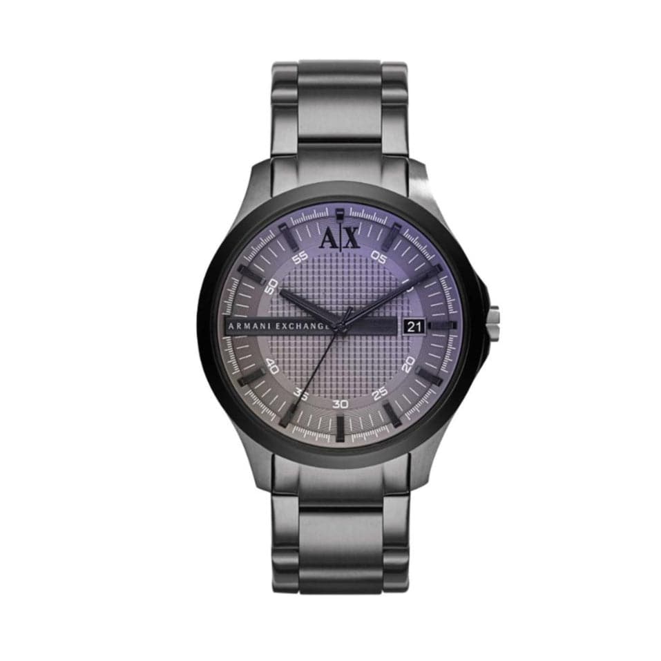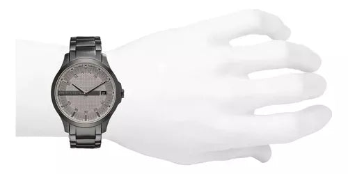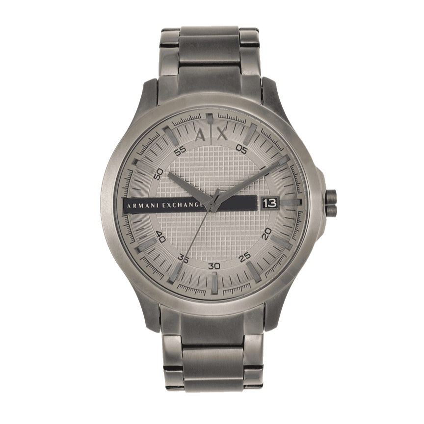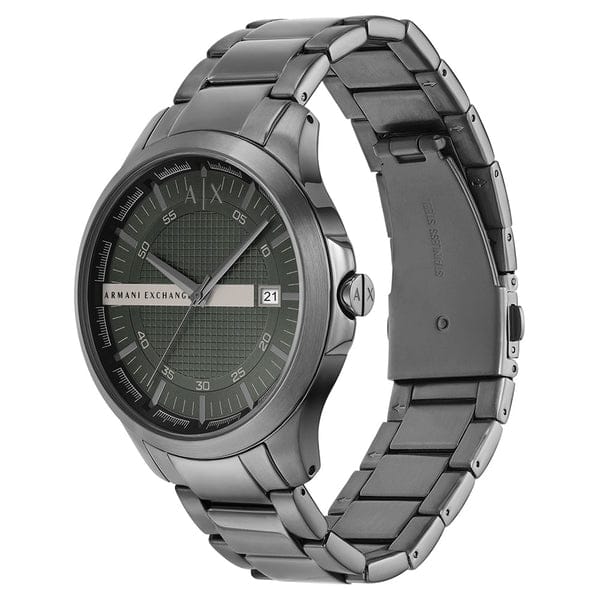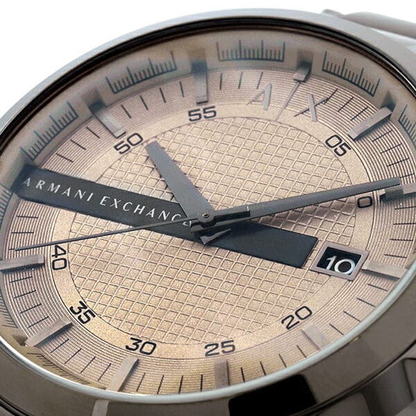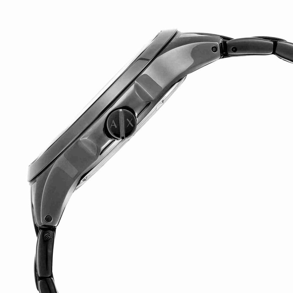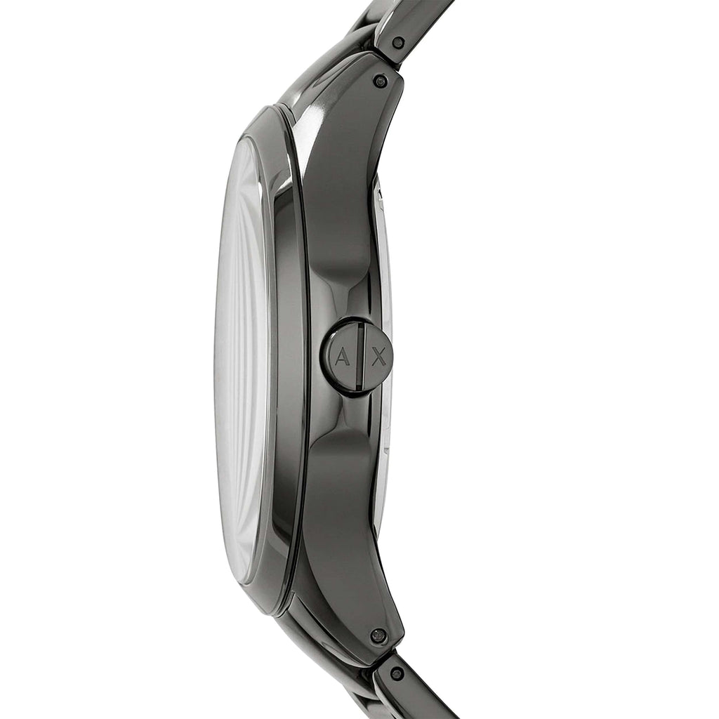 Gunmetal ion-plated stainless steel case and bracelet. Fixed gunmetal ion-plated bezel. Light grey etched dial with gunmetal hands and index hour markers. Arabic numeral minute markers (at 5 minute intervals). Minute markers around the outer rim. The Armani Exchange logo appears at the 12 o'clock positions.