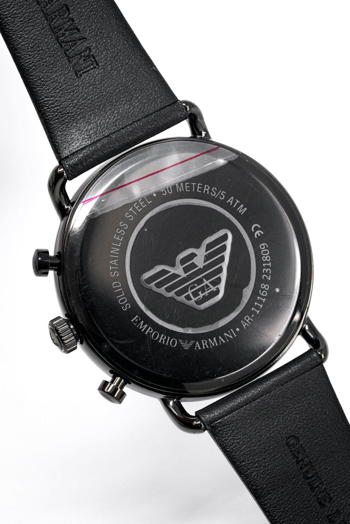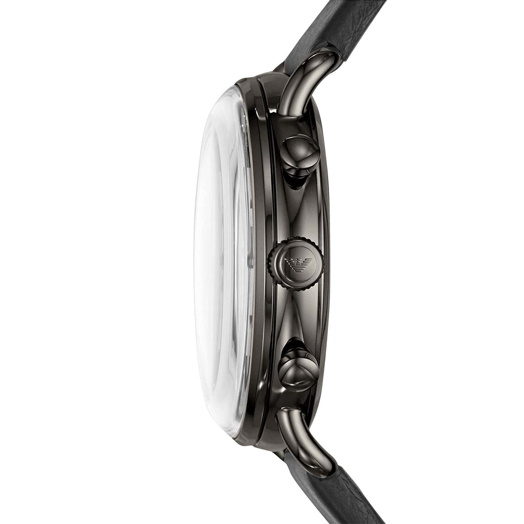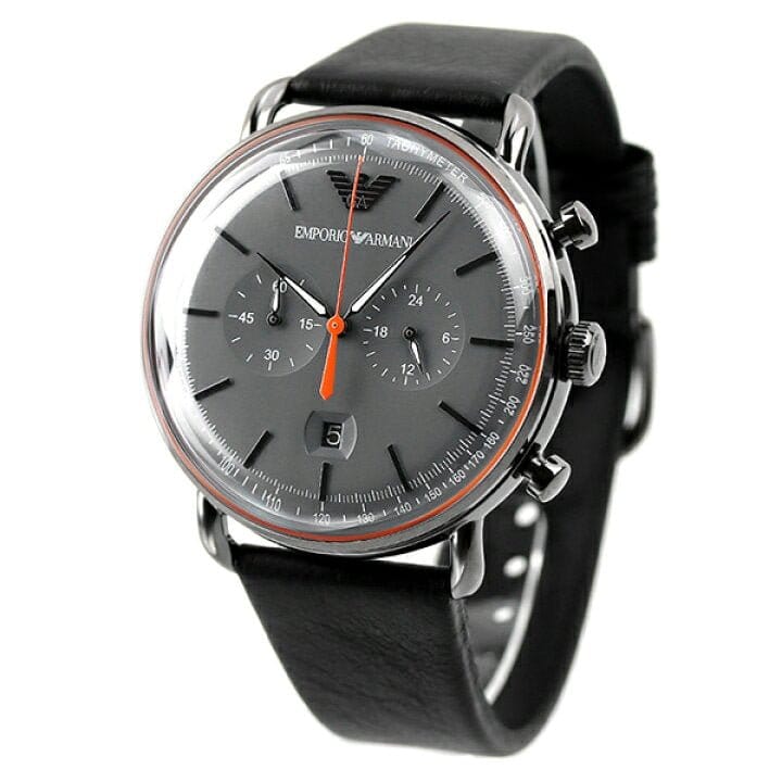 A perfect amalgamation of modern and sports styles, from the Aviator collection from the House of Emporio Armani. This grey chronograph dial features a date function, black baton hour markers, and blue touches. It fastens with a black leather strap and is powered by a quality quartz movement. This watch is surely going to leave its subject in awe with its design and performance. A secure pin buckle clasp was added for protection.