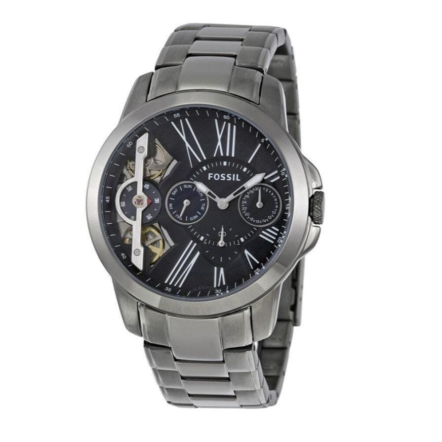 Smoke ion-plated stainless steel case and bracelet. Fixed smoke ion-plated bezel. Blue dial (with skeletal display) with luminous silver-tone hands and Roman numeral hour markers. Minute markers around the outer rim. Dial Type: Analog. Date display at the 3 o'clock position. Four multi-function sub-dials displaying: date, day of the week, and 60 seconds. Automatic movement.
