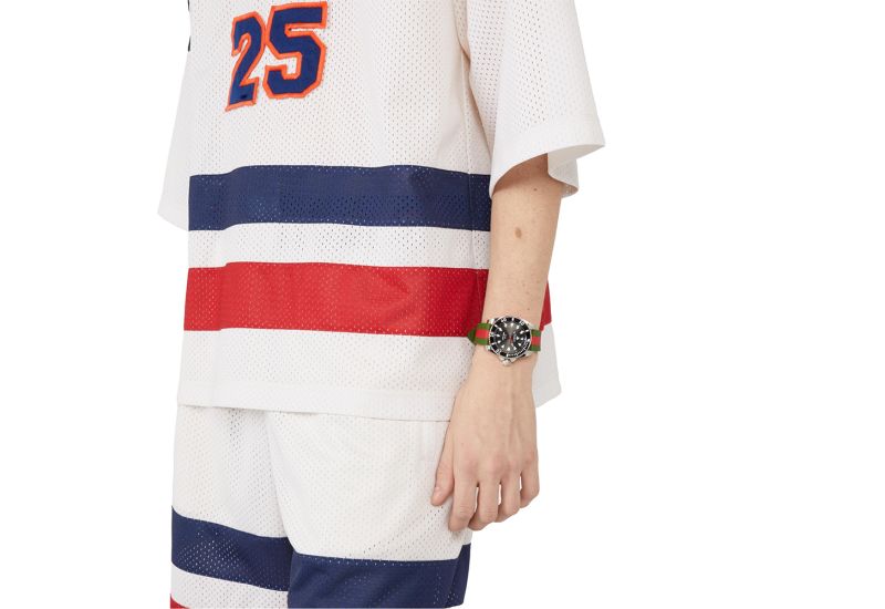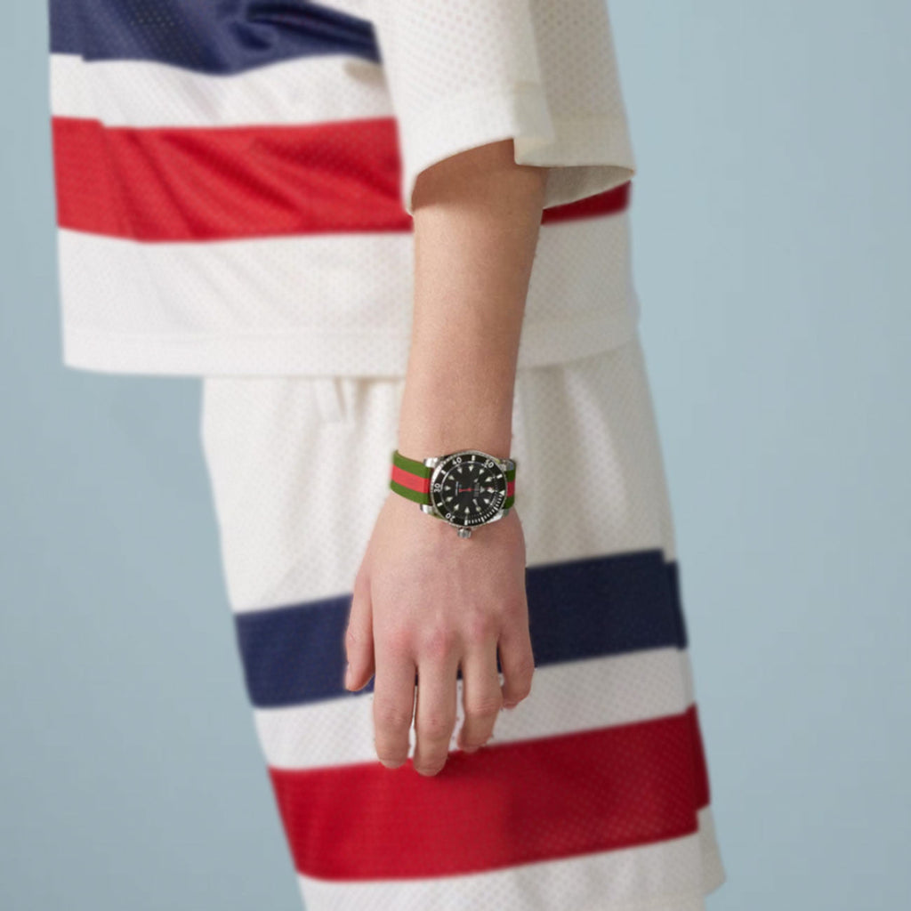 The Gucci Dive watch is a new addition to the brand's iconic dive watch collection. This stylish timepiece combines two of Gucci's most recognizable symbols: the Web stripe and the Gucci bee. The watch features a steel case and a ceramic bezel, and the black dial is adorned with the iconic bee motif. The strap is made of red and green rubber Web, which adds a touch of playful luxury to the overall look.