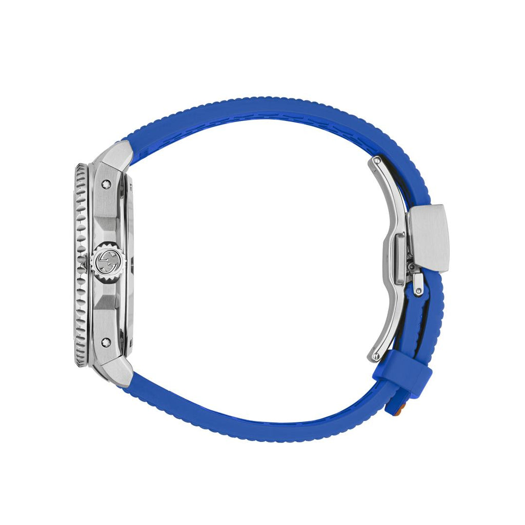 Gucci Watch Dive 40mm YA136352. A new introduction to the Dive family, the watch combines the House symbolic elements: the Web stripe and the Gucci bee. Designed with a steel case and a steel bezel, the accessory is defined by a dark grey dial featuring the emblematic bee motif. A blue and brown rubber Web strap completes the style.