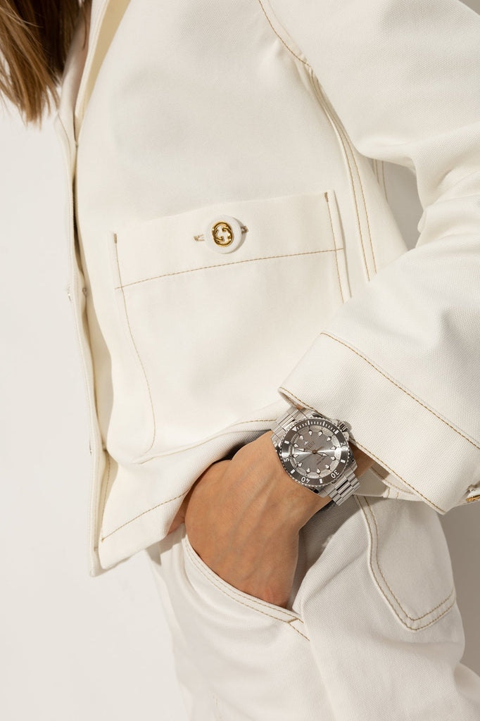 Silver-tone ‘Gucci Dive’ automatic watch from Gucci. This model features a stainless steel bracelet and 40mm case, a dial with the brand's signature bee and logo as well as sapphire glass with antireflective coating.