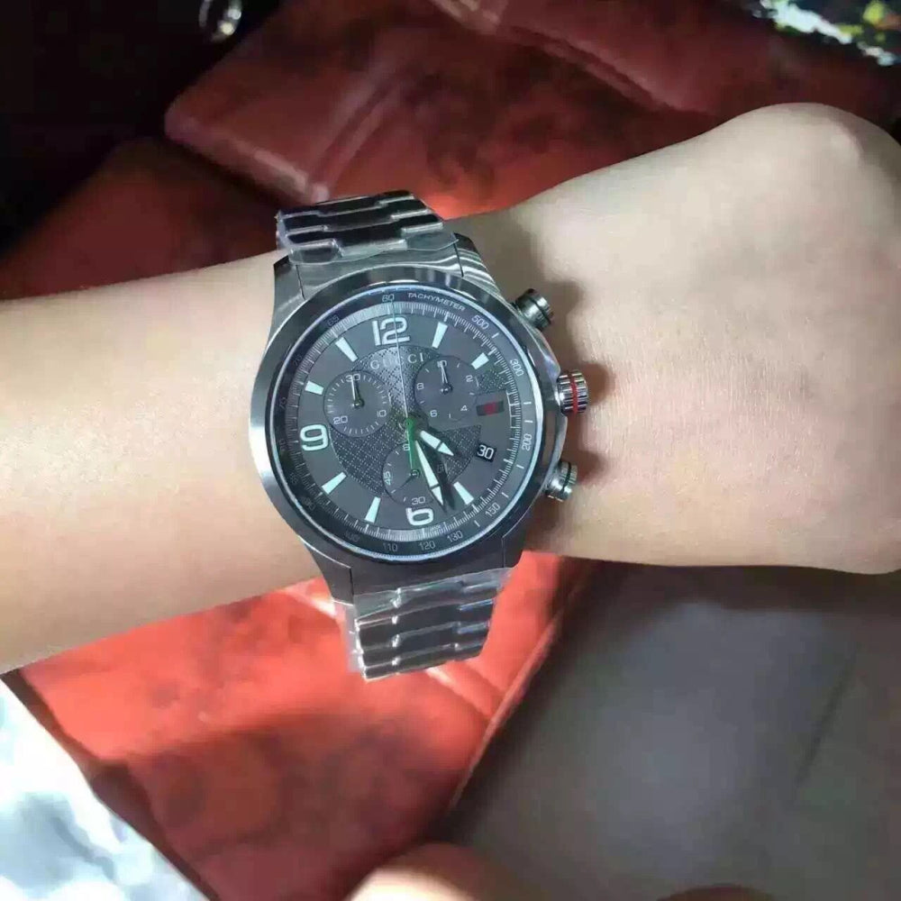 Pull / push crown. Solid case back. Case diameter: 44 mm. Case thickness: 12.5 mm. Round case shape. Band width: 24 mm. Fold over deployment clasp. Water resistant at 50 meters / 165 feet. Functions: chronograph, tachymeter, date, hour, minute, second. Dress watch style. Gucci G-Timeless Chronograph Brown Dial Stainless Steel Mens Watch YA126248.