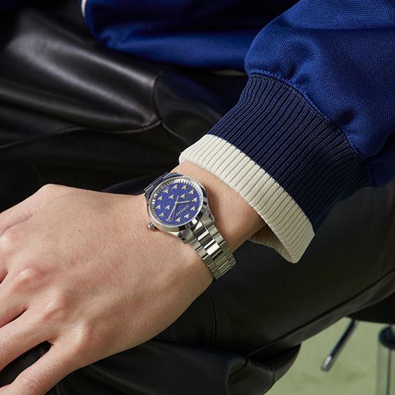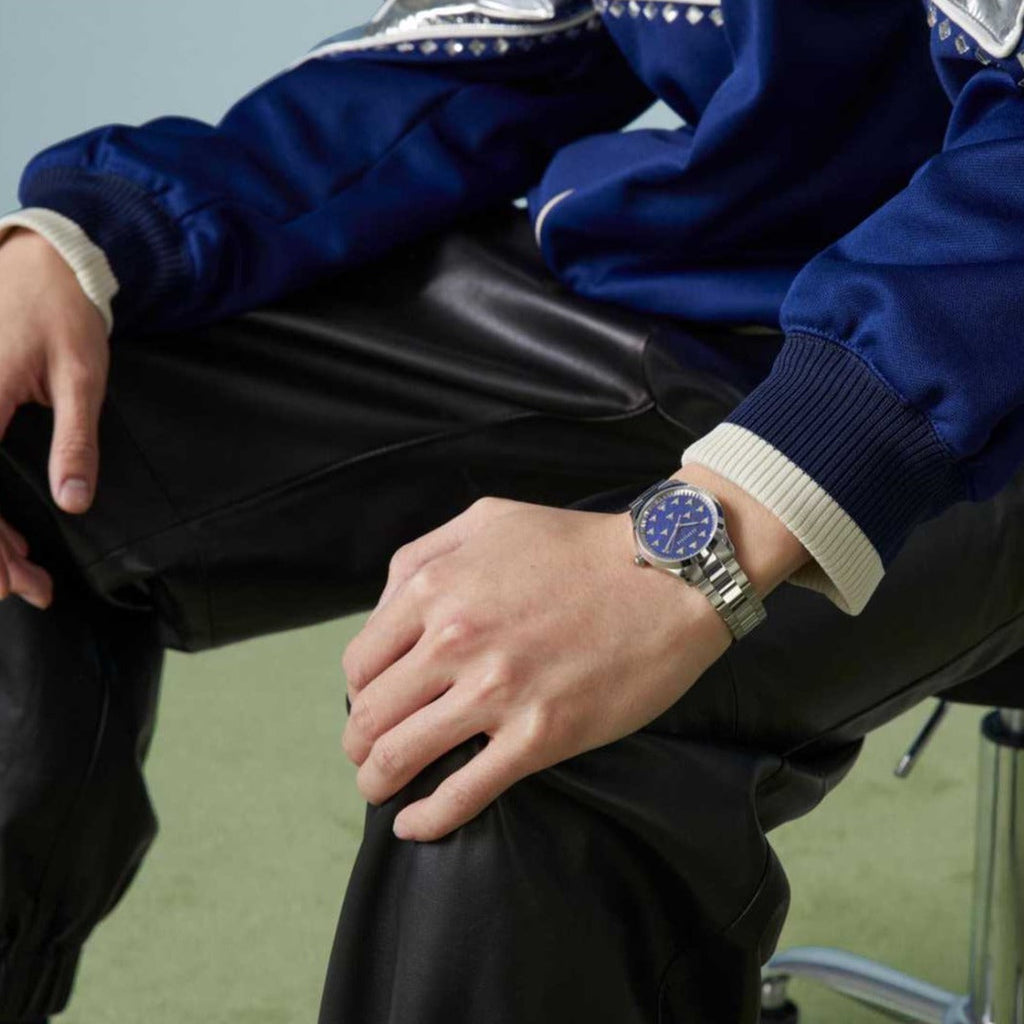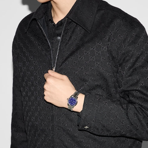 The Gucci bee, a historical symbol from the '70s archives, is combined with a dark blue lapiz stone dial and a steel bracelet. The G-Timeless collection combines classic design details with a contemporary aesthetic to create elevated watches with a timeless feel.