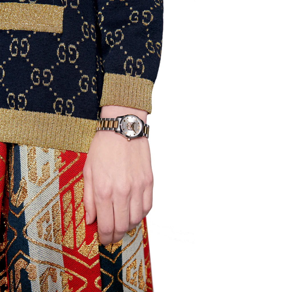 Gucci women's watch from the G-Timeless collection. Swiss Made quartz movement. Case diameter 27 mm made of steel with golden bezel. Bracelet made of steel in silver and gold color. Silver dial with yellow gold feline head motif. Water resistance is 3 ATM. Reference: YA126596