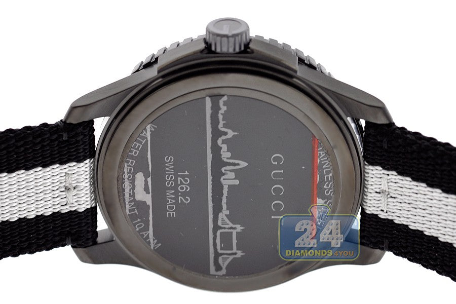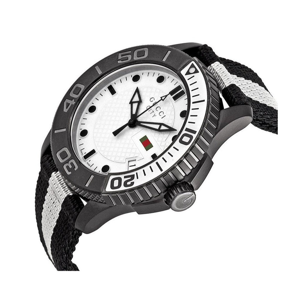 Case thickness: 11 mm. Round case shape. Band width: 22 mm. Band length: 9 inches. Tang clasp. Water resistant at 100 meters / 330 feet. Functions: date, hour, minute, second. Casual watch style. Watch label: Swiss Made. Gucci G-Timeless XL White Dial Black and White Nylon Men's Watch YA126243.