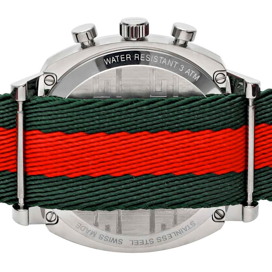 Cushion case shape, case size: 40 mm. Buckle clasp. Water resistant at 30 meters / 100 feet. Functions: hour, minute, second. It also has a beautiful red dial face with 2 windows indicating hours and one for minutes. Grip Series. Luxury watch style. Watch label: Swiss Made. Item Variations: ?652711 I1820 6421. Gucci Quartz Mens Grip Chronograph Green and Red Nylon Strap Watch YA157304.