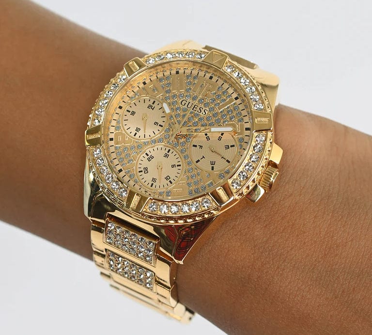 Bring your bling game to the next level with this stunning timepiece. It is embellished with crystals on the case and bracelet. The glitz multi-function dial features cut-out detailing showing the movement of the watch.